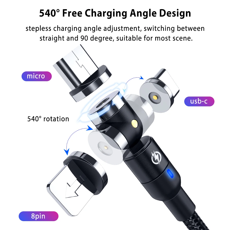 -Светодиодный индикатор: легко найти кабель в ночное время с светодиодный-индикатором. Мягкое освещение не ослепляет вас во время сна. -Ультра прочный: металлический порт + нейлоновая оплетка, делает продукт прочным и устойчив к запутыванию и запутыванию. -Простота зарядки: вилка отделена от кабеля. Вилка может оставаться на телефоне, только 1 секунда подключена для зарядки. -Поддержка вращения на 180 и 360 градусов, очень удобно во время игр. -Поддержка быстрой зарядки и передачи данных.