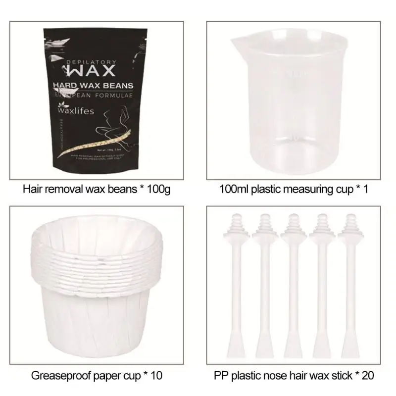 4. Этот продукт содержит восковые бобы для удаления волос, термостойкие стаканчики, бумажные стаканчики, восковые палочки и т. Д., полные инструменты, легко удаляют лишние волосы в носовой полости.