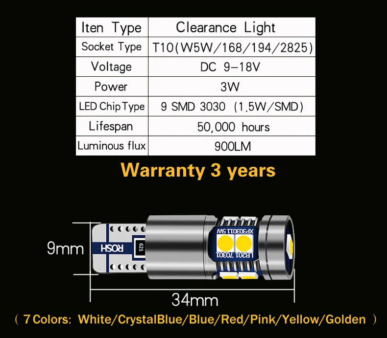 Посылка: 1 шт., светодиодная лампа Описание продукта: Подходит для большинства виды машин. Совместим с: 194,T10,W5W,168,2825 Особенности: 1. Название бренда: VENDY 2. Неполярность 3. Светодиодный чип Тип: 9SMD 3030 чип (1,5 W/SMD) 4. Светодиодный цвет: белый, прозрачный, синий, желтый, синий, красный, розовый, золотой 5. Тип розетки: T10 w5w 194 6. Напряжение: 12 в пост. Тока 7. Мощность: 3 Вт 8. Световой поток: 900 лм 9. Материал: алюминий 10. Срок службы: 50000 часов Низкая температура, низкий расход энергии Добавьте стиль и Осветите свой автомобиль.
