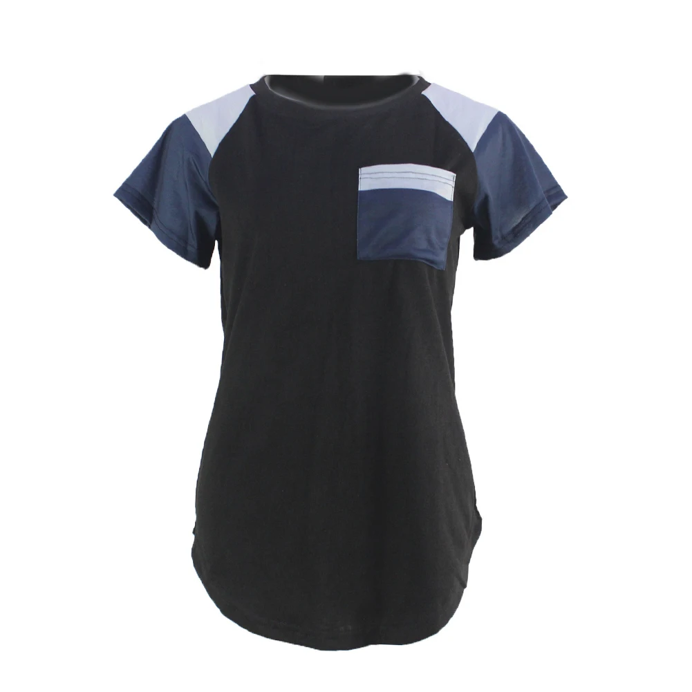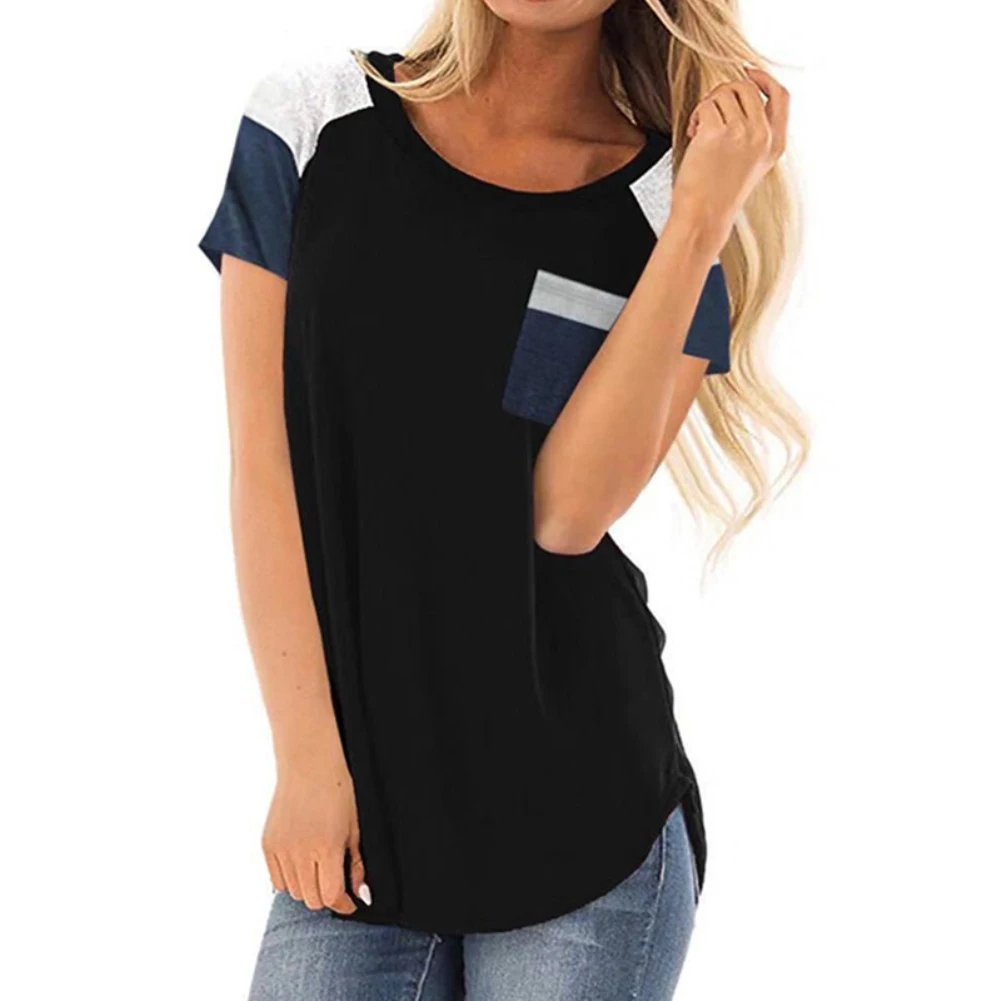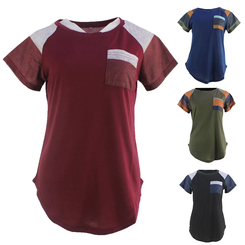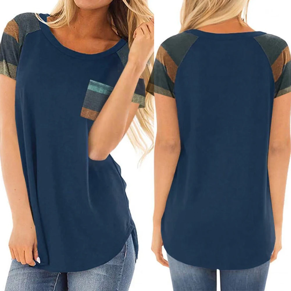 Женская свободная футболка в полоску с карманом и круглым вырезом, блузка с коротким рукавом