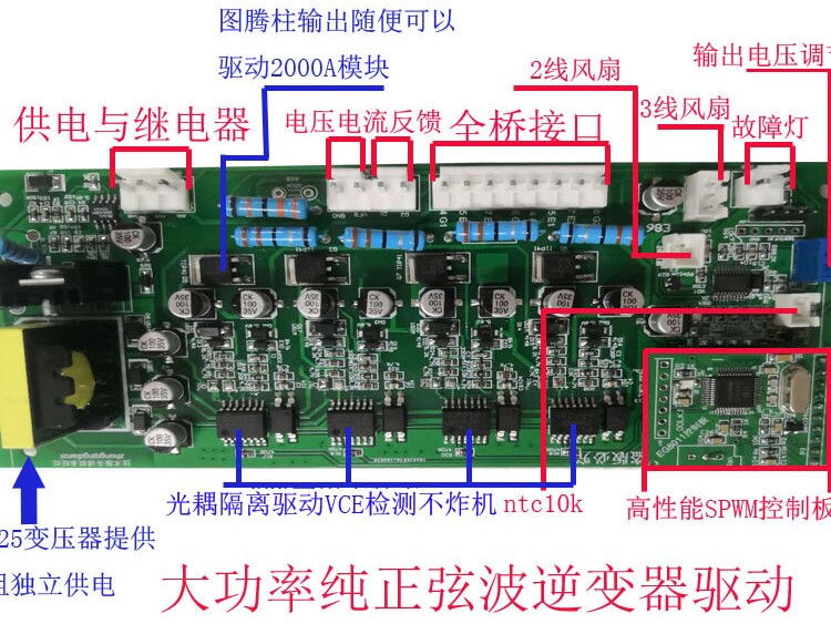 Эта плата драйвера развивалась из многих версий и, наконец, готова к массовому производству! С помощью вентилятора контроля скорости PWM, плата управления и приводная плата могут быть оснащены многими контрольными платами. Плата привода PC929 + totem pole drive. Имеет ток отключения привода отрицательного напряжения 12А. Он может управлять большинством модулей IGBT. PC929 является очень зрелым инверторным приводом, имеет функцию мягкого отключения, перегрузки и защиты от короткого замыкания. Он может управлять 150A IGBT модулем в качестве 10 кВт инвертора. Мощность отличная и действительно классная! Плата драйвера использует блок питания 12 В, который в основном предназначен для удобной отладки. Безопасно использовать 12 В для отладки. Не будьте осторожны, а затем тщательно отлаживайте! Кто-то спросил, имеет ли плата драйвера защиту от короткого замыкания от перегрузки по току, почему бы не использовать Пробоотборные резисторы! Позвольте мне ответить на ваши вопросы. Плата драйвера использует VCE устройство обнаружения падения напряжения трубки для защиты от перегрузки и короткого замыкания быстрее, чем с помощью пробоотборных резисторов, и питание следует за модулем. Мощность обычно не регулируется, если трубка изменена! Эта плата драйвера может управлять MOS или IGBT одной трубкой. Конечно, он в основном используется для привода IGBT модулей. Некоторые клиенты могут управлять модулями до 1200 в 1200А! Есть переменные и основные режимы модуляции для платы драйвера!