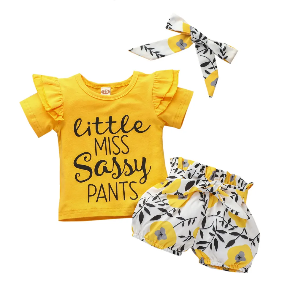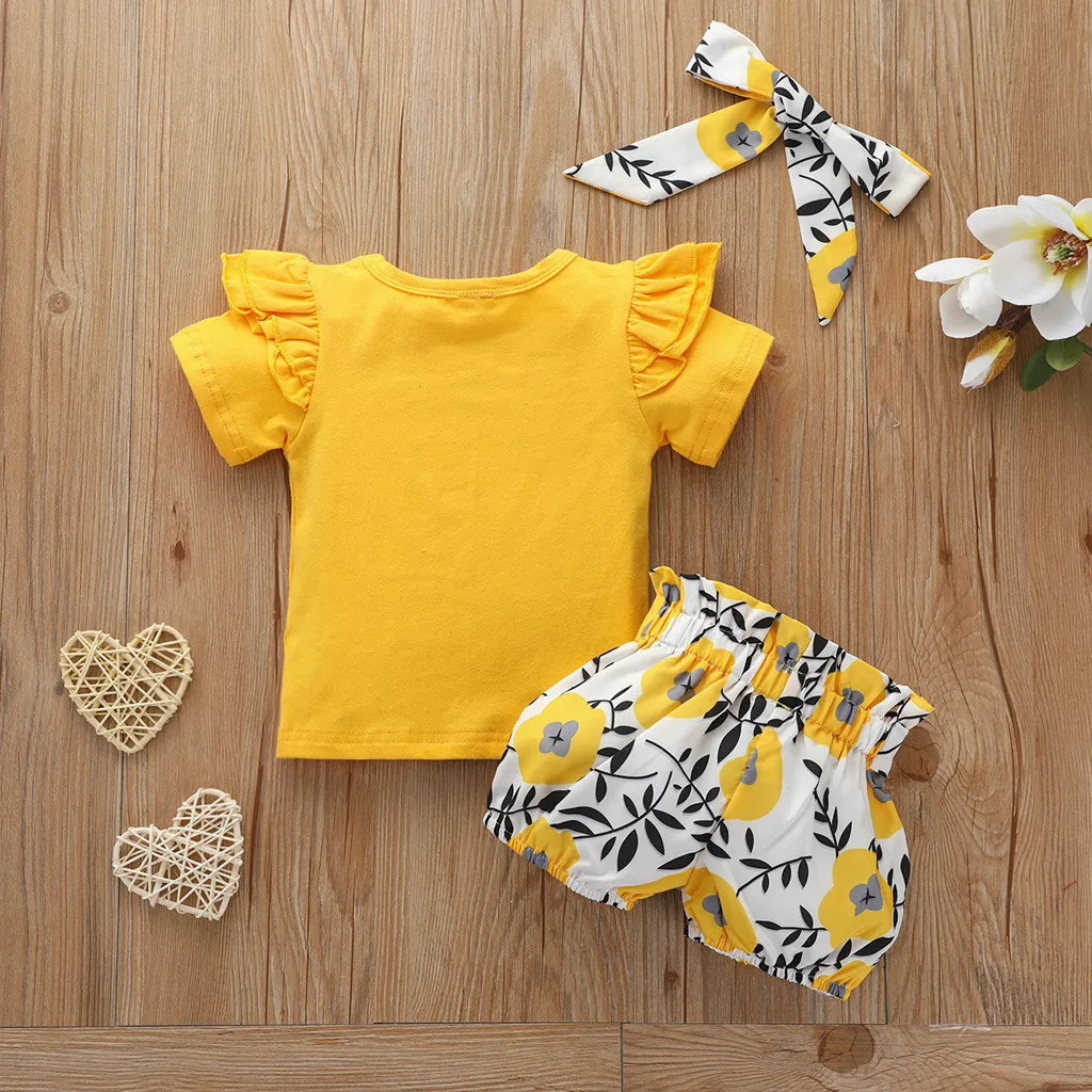 Топы для новорожденных девочек с надписью, футболка, шорты с цветочным принтом, комплект с повязкой на голову
