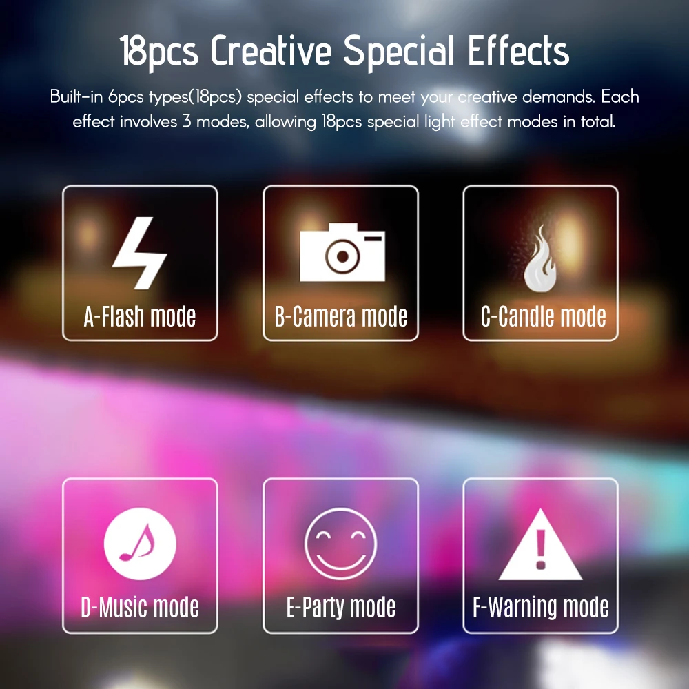18 шт креативные спецэффекты:Встроенные 6 типов шт (18 шт) специальные эффекты для удовлетворения ваших творческих потребностей, включая режим A-Flash, Режим B-Camera, режим C-Candle, Режим D-Music, режим E-вечерние, Предупреждение (Полицейская машина, пожарная машина, скорая помощь); Каждый эффект включает в себя 3 режима, что позволяет 18 шт. специальный светильник режимов эффекта в общей сложности.