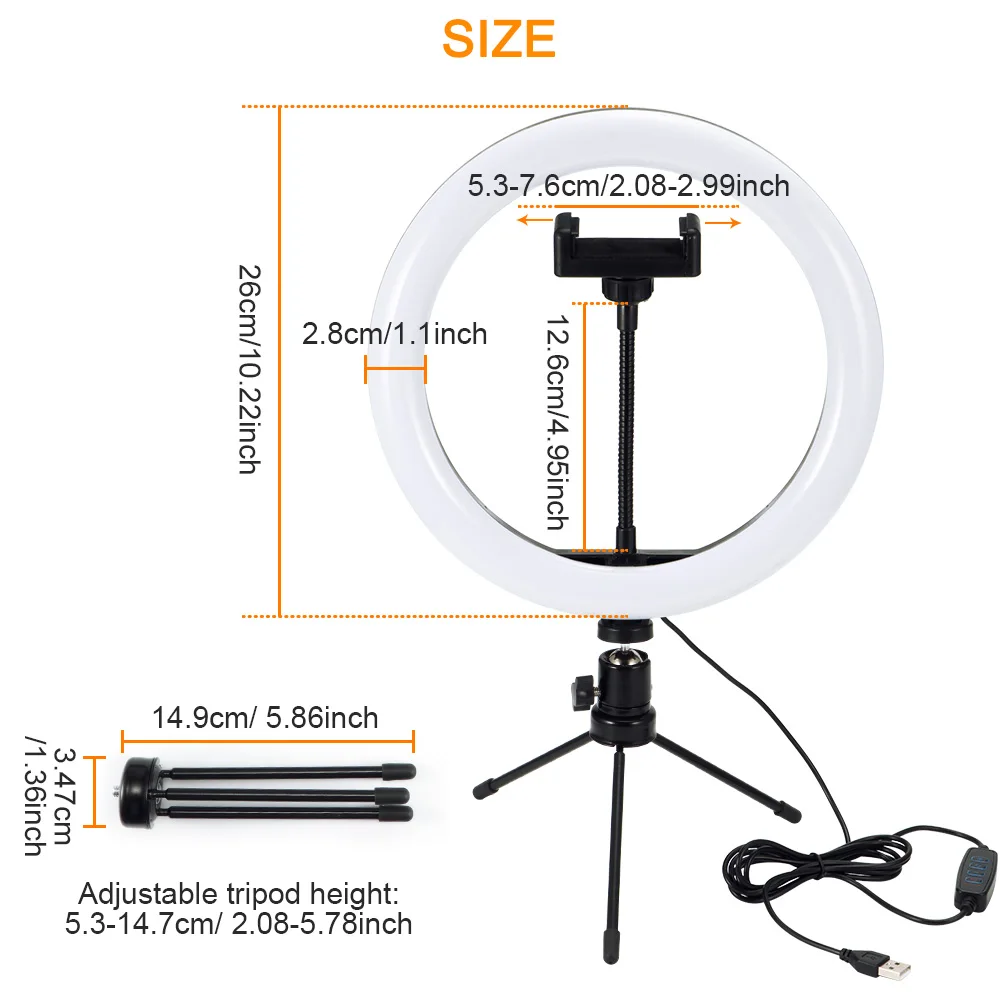 Кольцевой светильник заполняется складным штативом, который можно регулировать его высоту между 5,3-14,7 см/2,08-5,78 дюйма в соответствии с практическими условиями. Также удобно хранить, когда он не используется.