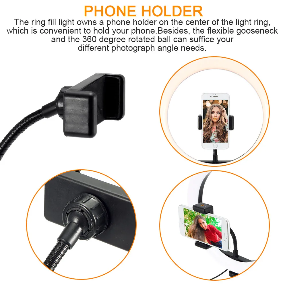 Светильник для заполнения кольца имеет держатель для телефона в центре кольца-светильник, который удобно держать телефон. Кроме того, гибкий гусиная шея и вращающийся шар на 360 градусов могут быть достаточны для вашего различного угла съемки.