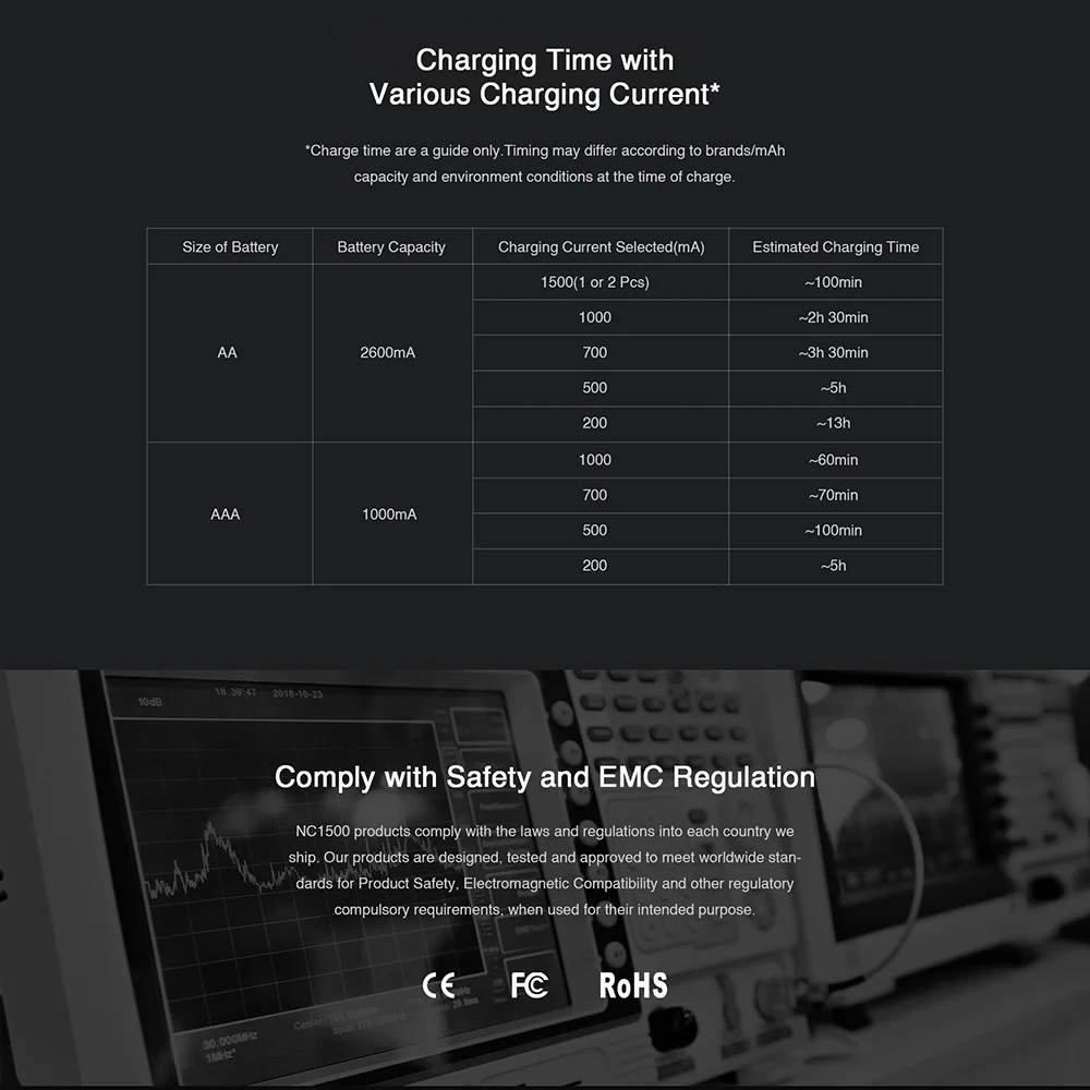 NC1500 имеет 4 независимых слота и поддерживает батарейки AA/AAA NiMH, обеспечивая максимальную скорость зарядки 1500mA. 1-4 шт. NiMH AA или AAA могут заряжаться одновременно в любых комбинациях.