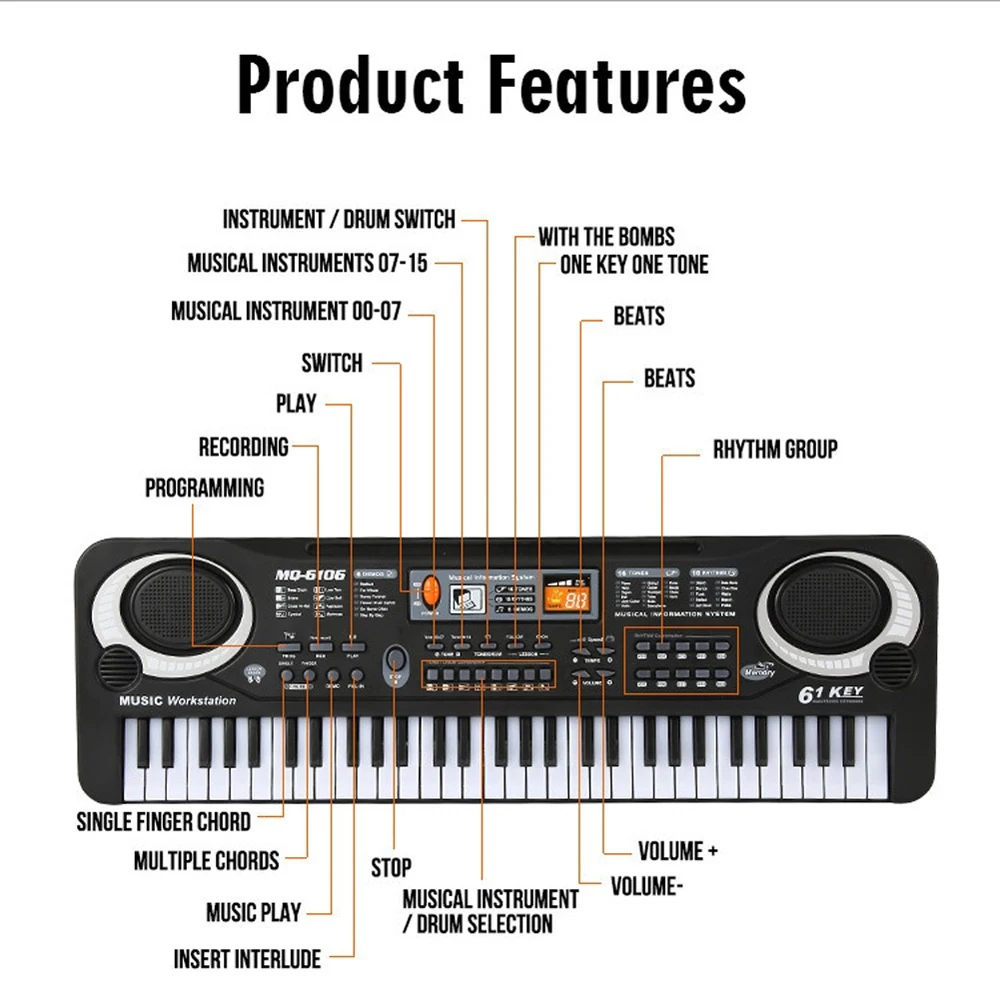 С отличной функцией 16 видов тембра, 8 видов записи ударных инструментов, 10 видов ритма, 6 демов также с регулировкой громкости.