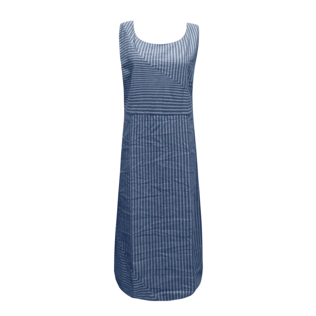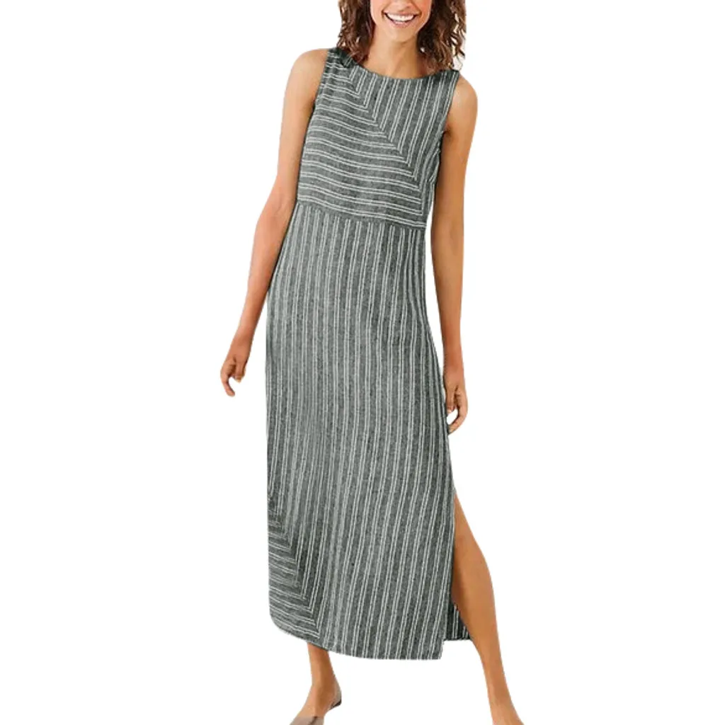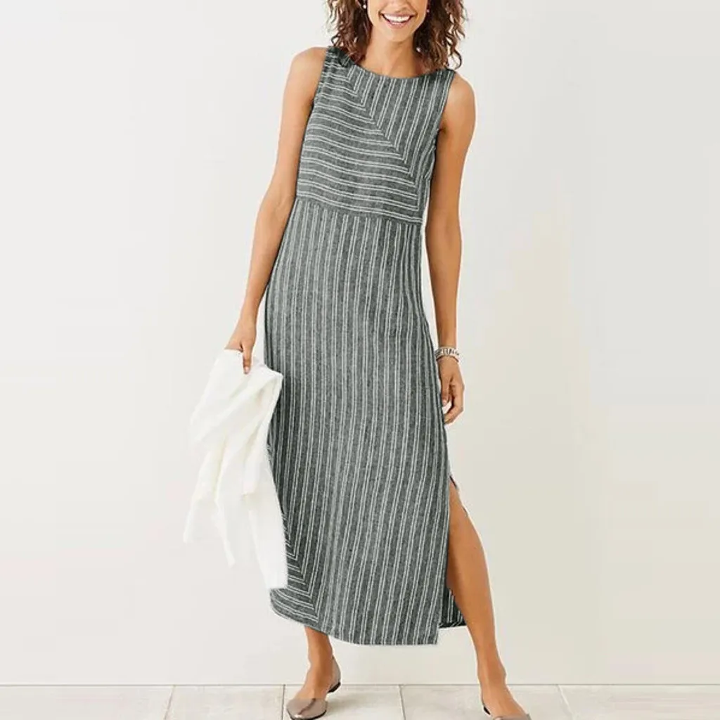 Женское повседневное длинное льняное платье в полоску, без рукавов, с вырезом лодочкой