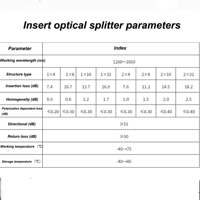 Название продукта: Тип вставки 1 точка 16 волоконный сплиттер Разделитель луча является пассивным устройством, он не требует внешней энергии, пока есть входной светильник. После того, как светильник попадет в пучок, обычный светильник можно разделить на следующие три типа в зависимости от длины волны: Около УФ: 200 ~ 380 нм; Вакуумный ультрафиолетовый (вакуумный УФ): 10 ~ 200 нм; Экстремальный УФ (EUV): 1 ~ 10 нм Использование продукта: широко используется в сетевой интегрированной проводке, волоконно-домашней (FTTH), системах оптической связи, волоконно-испытательном оборудовании, кабельных телевизионных сетях и т. д. Принцип продукта: как система передачи коаксиального кабеля, система оптической сети также должна соединить, филировать и распределить оптические сигналы. Для этого требуется оптический сплиттер. Оптический Сплиттер, также известный как Оптический Сплиттер, является одним из наиболее важных пассивных компонентов в оптических волоконных звеньях. Он имеет несколько входных концов и несколько выходных концов. Это тандемное волоконно-оптическое устройство. M × N часто используется для обозначения входов M и N выходов. Оптические разветвители, используемые в системах CATV оптического волокна, обычно состоят из 1 × 2, 1 × 4 и 1 × N оптических разветвителей. Параметры продукта Рабочая длина волны: 1260нм ~ 1650нм Направленность: ≥ 55dB Потеря возврата: ≥ 50 дБ Рабочая температура: -40 ℃ ~ + 75 ℃ Температура хранения: -40 ℃ ~ + 85 ℃ Вес нетто: 0,25 кг Размер продукта: 13 см × 10 см х 5 см Продукт Особенности: 1. Светильник равномерно распределен, и сигнал может быть равномерно распределен среди пользователей. 2, компактная конструкция, может быть установлена непосредственно в существующих обменных коробках и не требует большого пространства для установки. 3. Потеря не чувствительна к длине волны светильник. Может удовлетворить потребности передачи различных длин волн!
