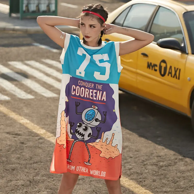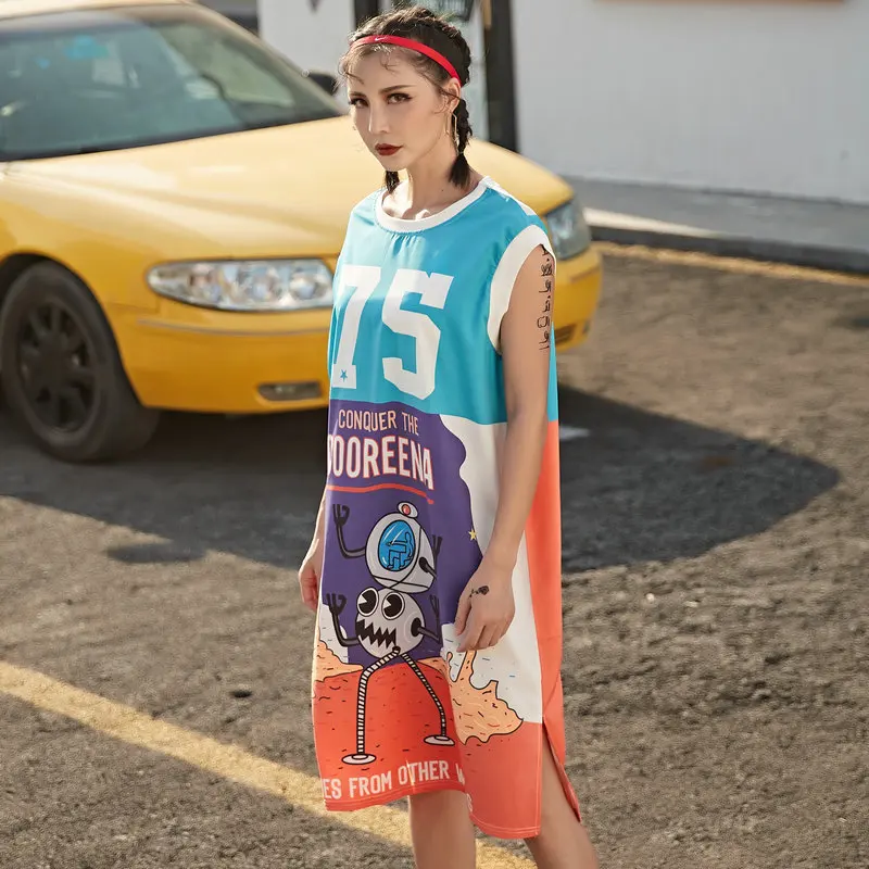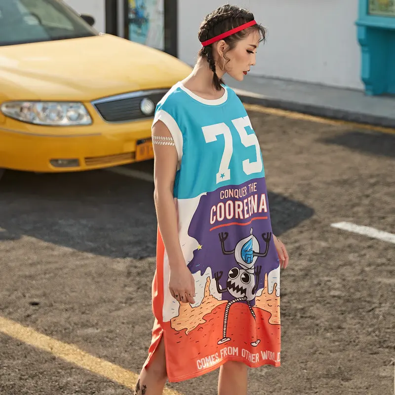 Длинное платье-футболка, женские летние топы, Mujer, спортивные, 2020, плюс размер, Забавный Инопланетянин, робот, граффити, цвета, блок, сзади, из кусков, сетка