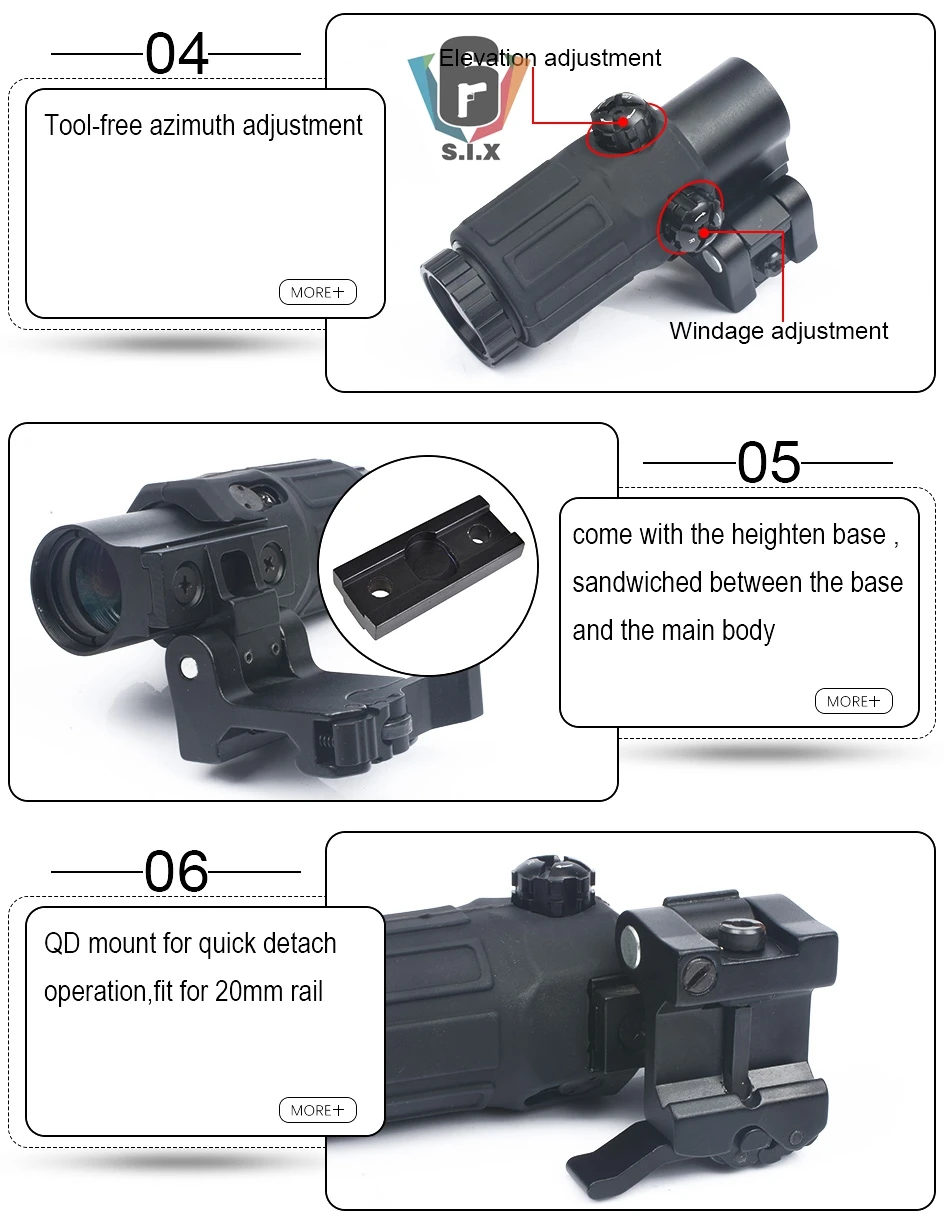 (3) улучшенное крепление переключателя в сторону (STS) позволяет быстро переключаться между 3-кратным увеличением и 1-кратным увеличением