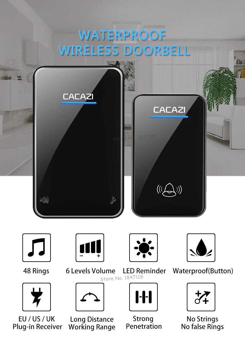CACAZI EU US UK Plug водонепроницаемый беспроводной дверной звонок 48 колокольчиков 6 громких звонков для дома 1 2 светодиодный дверной звонок кнопки 1 2 3 приемника