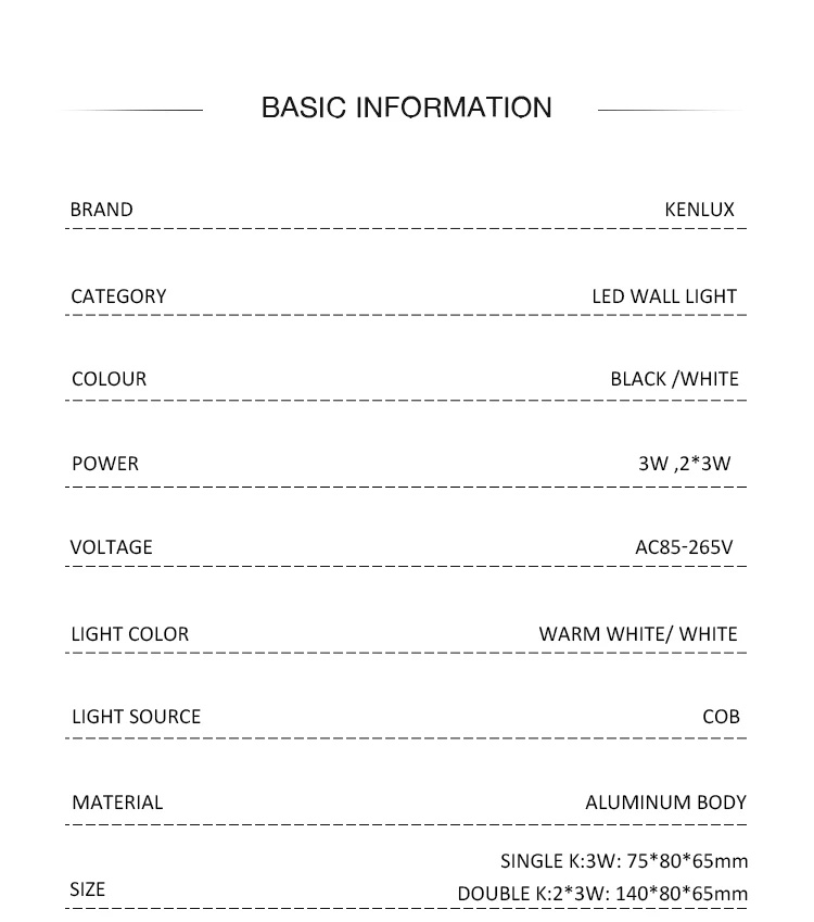 1. Мощность: 2*3 Вт двойная 2. Чип: чип COB 3. Цвет излучения: белый/теплый белый 4. Цвет корпуса: белый/черный 5. Вход напряжение: 85-265 В переменного тока, 50/60 Гц 6. Материал корпуса: алюминий 7. Размеры: 2*3 Вт: 140*80*65 мм 8. IP 65 водонепроницаемый 9. Люмен: светодиодный чип 100-120лм/Вт