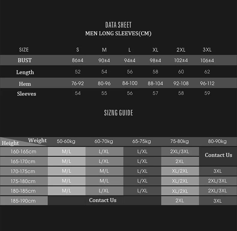 Мужская Таблица размеров с длинными рукавами