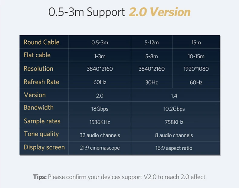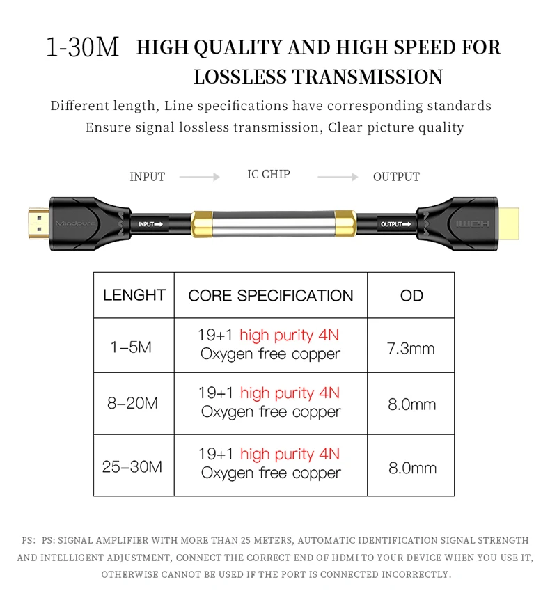 Название продукта: HDMI-HDMI кабель папа-папа Версия: HDMI 2,0 Разрешение: 4K * 2K 60HZ (внутренний 0,5 ~ 3m),4K * 2K 30HZ(5 ~ 8m),1920*1080P 60 Гц (8 ~ 20 м) ,3D видео эффект Спецификация проводника: 1 ~ 10 м 28AWG(7/0.127),15 м 26AWG (7/0.16),20 м 28AWG(7/0.127) Конструкция сердечника: 19 + 1 шпилька Материал проводника: бескислородная медь Материал интерфейса: позолоченный 24K Внешний материал: экологически чистый ПВХ Outdiameter: 7,3 мм (1 ~ 5 м), 8,0 мм (8 ~ 20 м), Применимый объем: все устройства с интерфейсом HDMI, такие как dvd-плееры, подключенные к HDTV, проекторы, HD игра, компьютеры с интерфейсом HDMI, подключенные к HDTV, проекторы, PS3 машина подключена к HDTV