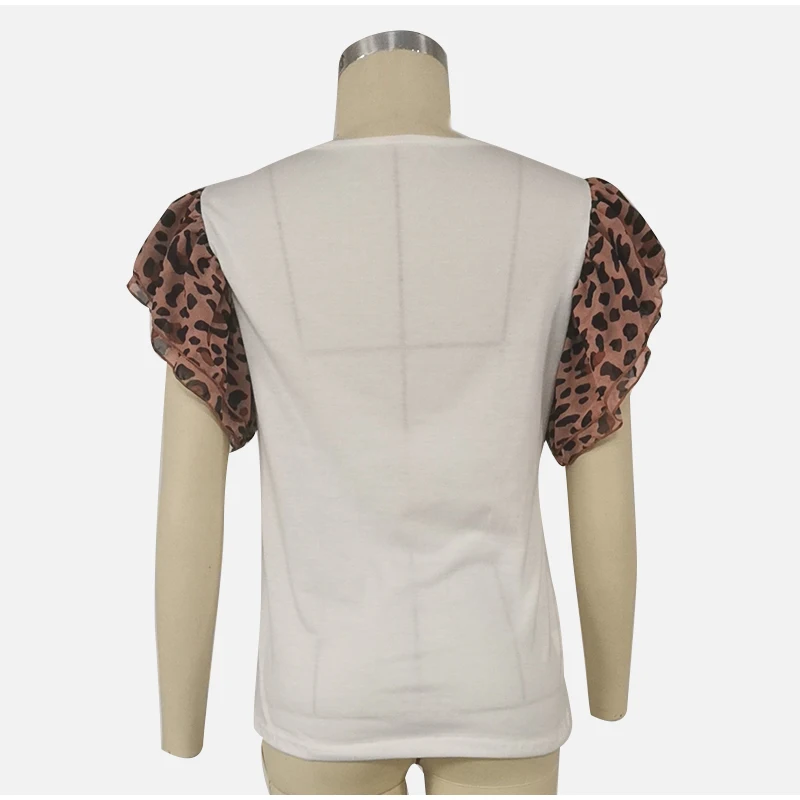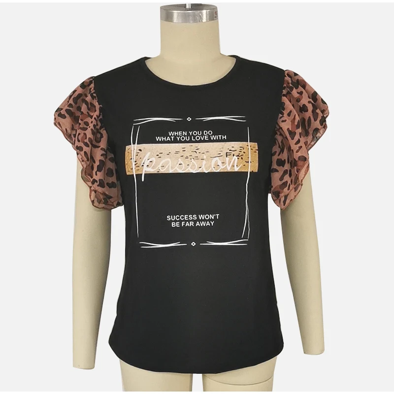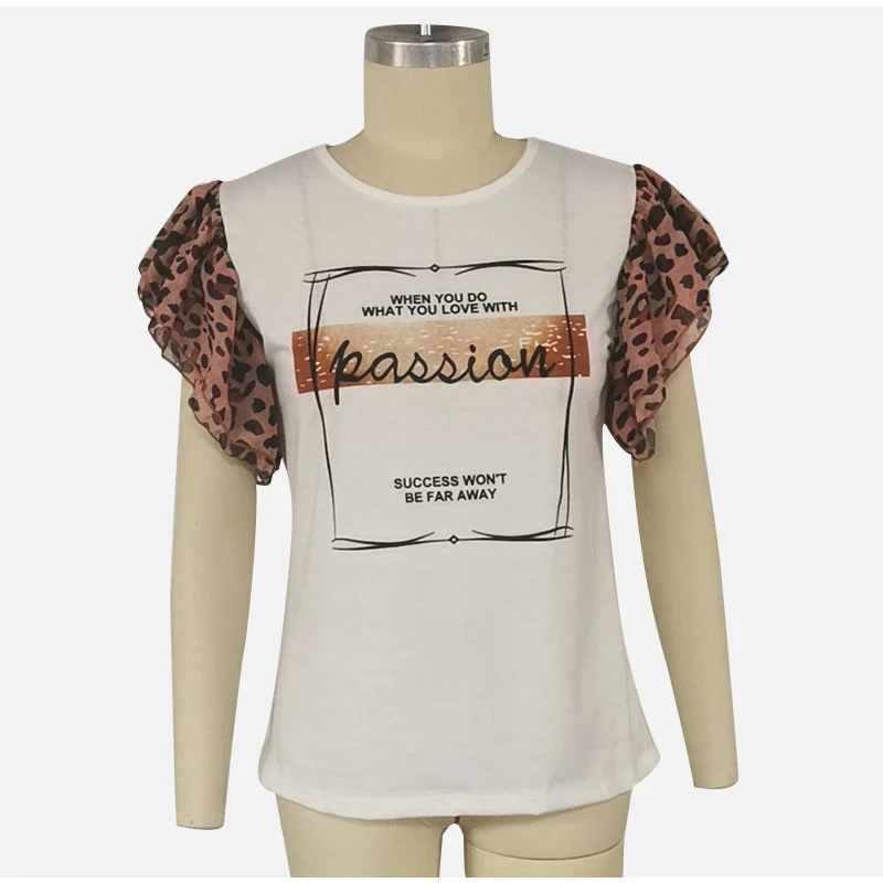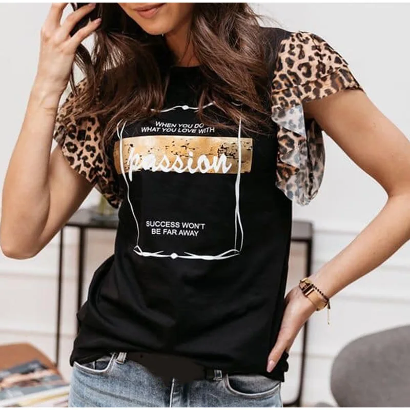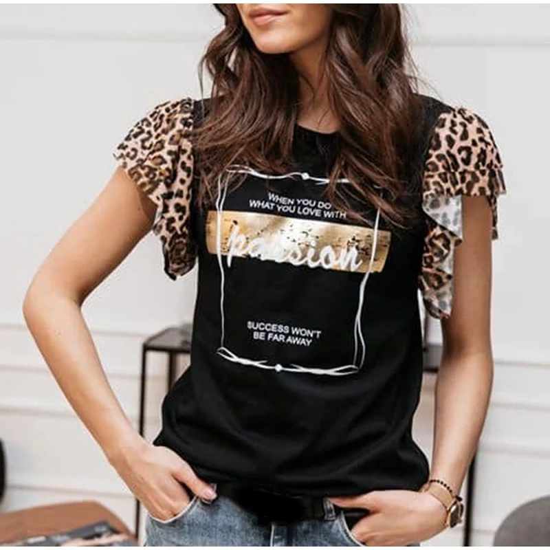 Леопардовая женская футболка с буквенным принтом, с круглым вырезом, с коротким рукавом-бабочкой, милые женские футболки, летняя повседневная тонкая модная женская футболка