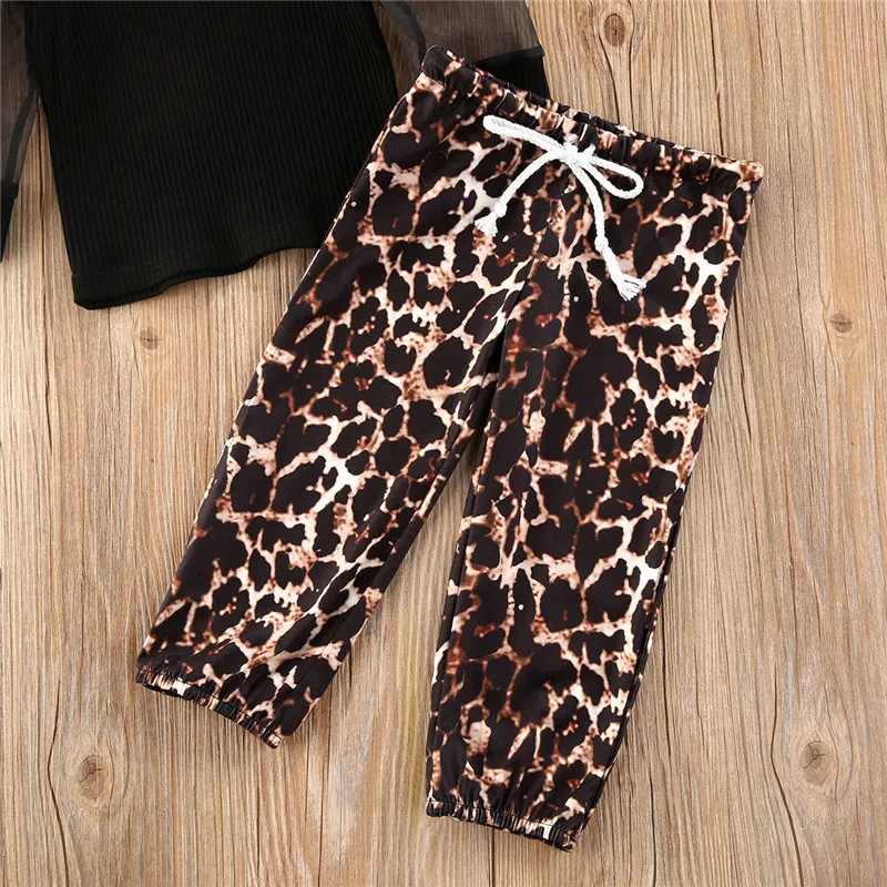Summer Toddler Girls Holiday Boho Clothes Sets Black Mesh Lace Puff Long Sleeve T Shirts Tops+Leopard Printed Pants Streetwear!