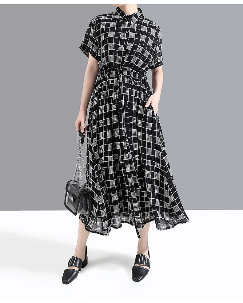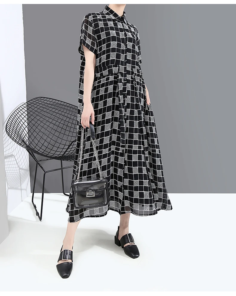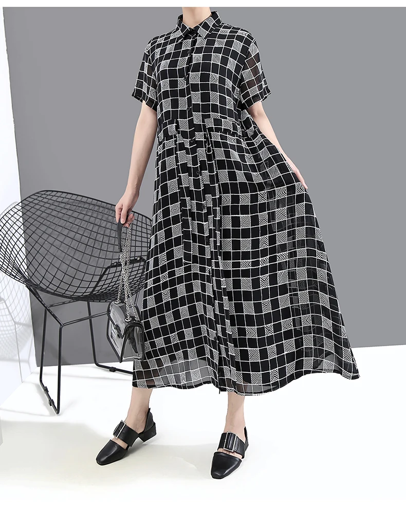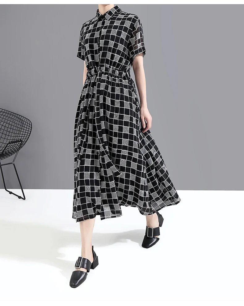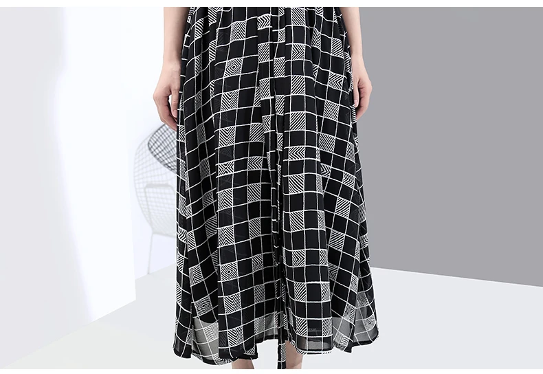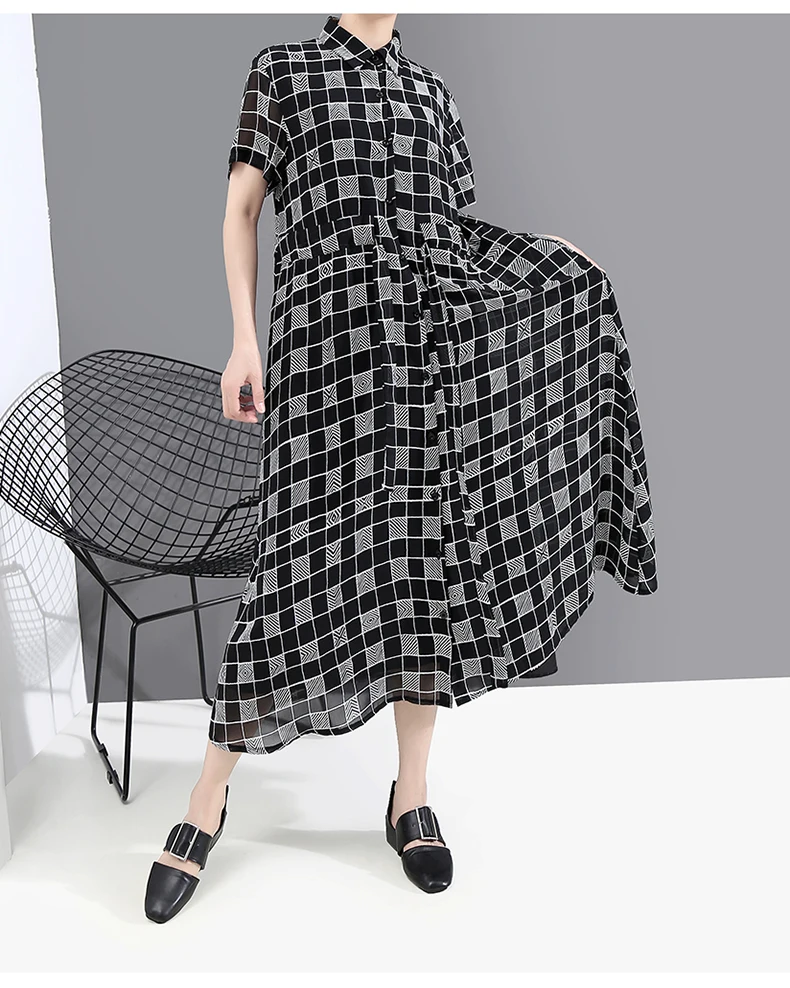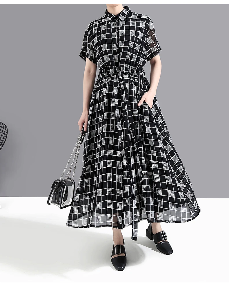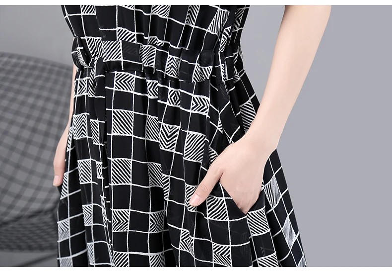 Новинка 2020, женское летнее модное Черное длинное платье в клетку с поясом, короткий рукав, офисное женское Стильное элегантное платье, vestidos 6306