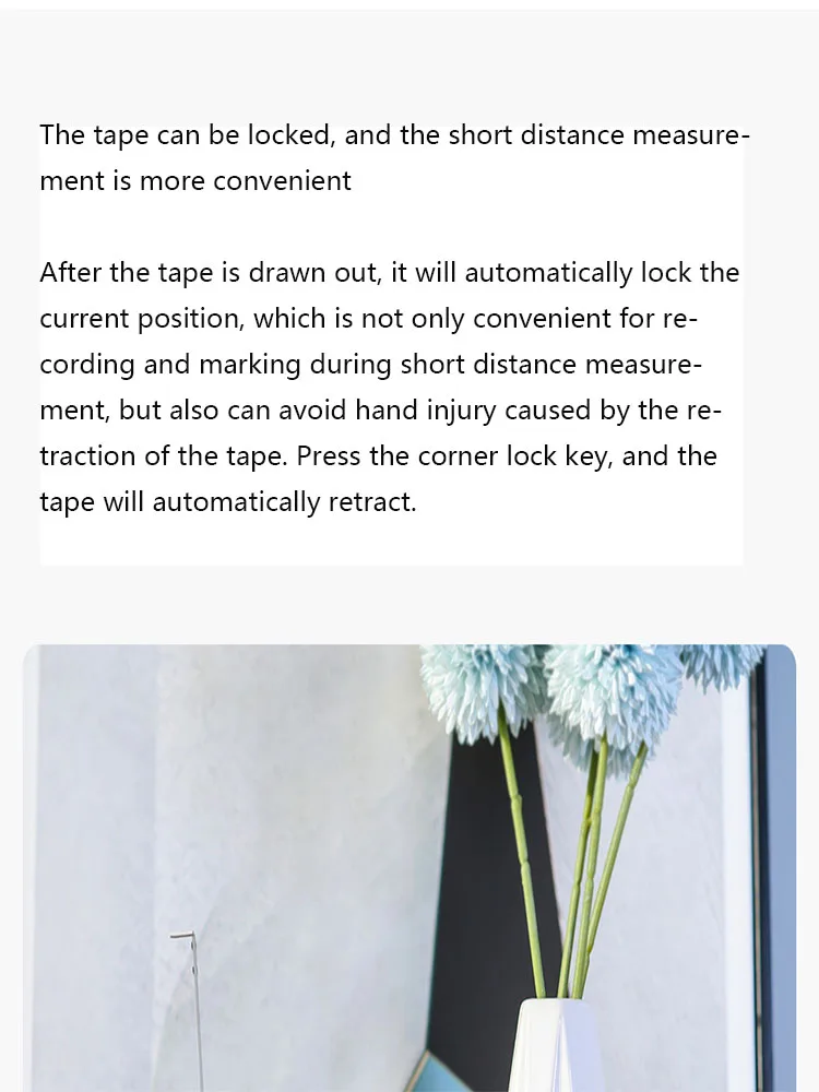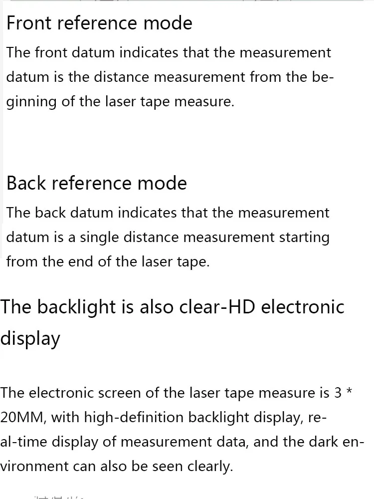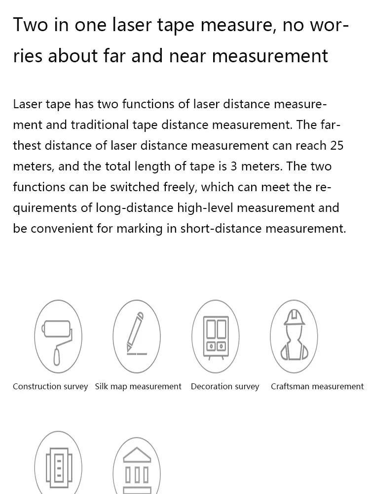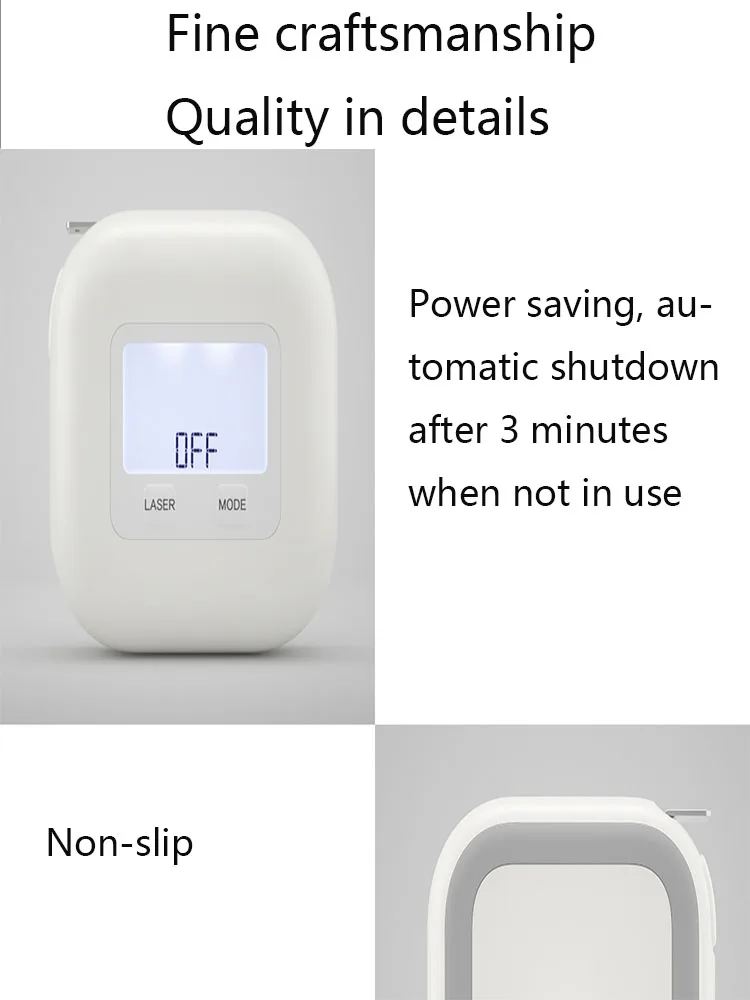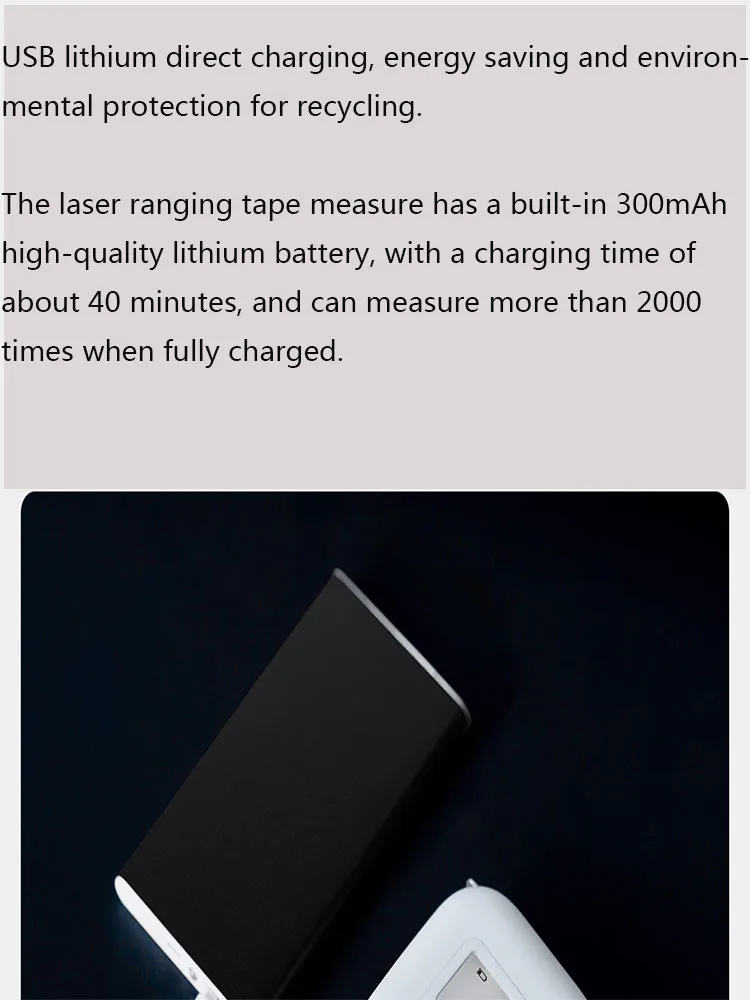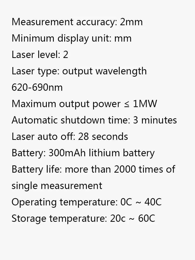 Параметр Точность измерения: 2 мм Минимальный дисплей: мм Лазерный уровень: 2 Тип лазера: Выходная длина волны 620-690нм Максимальная выходная мощность ≤ 1 мВт Автоматическое выключение: 3 минуты Автоматическое выключение лазера: 28 секунд Батарея: литиевая батарея 300 мАч Срок службы батареи: более 2000 раз одного измерения Рабочая температура: 0C ~ 40C Температура хранения: 20c ~ 60C Размер инструмента 70x70x31 мм, что немного меньше, чем у обычных шкал. Вес прибора составляет около 1458. Светильник портативный. USB литиевая Прямая зарядка, энергосбережение и защита окружающей среды для переработки Лазерный диапазон измерения ленты имеет встроенный литий-ионный аккумулятор высокого качества 300 мАч с временем зарядки около 40 минут и может измерять более 2000 раз при полной зарядке