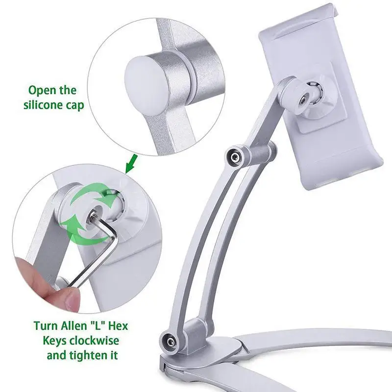 Используйте прилагаемые шестигранные кнопки в форме буквы «L» для регулировки и затягивания соединений для регулировки гибких соединений на 180 °. Регулировка стопы на 90 ° стабильно поддерживает ваши цифровые устройства.