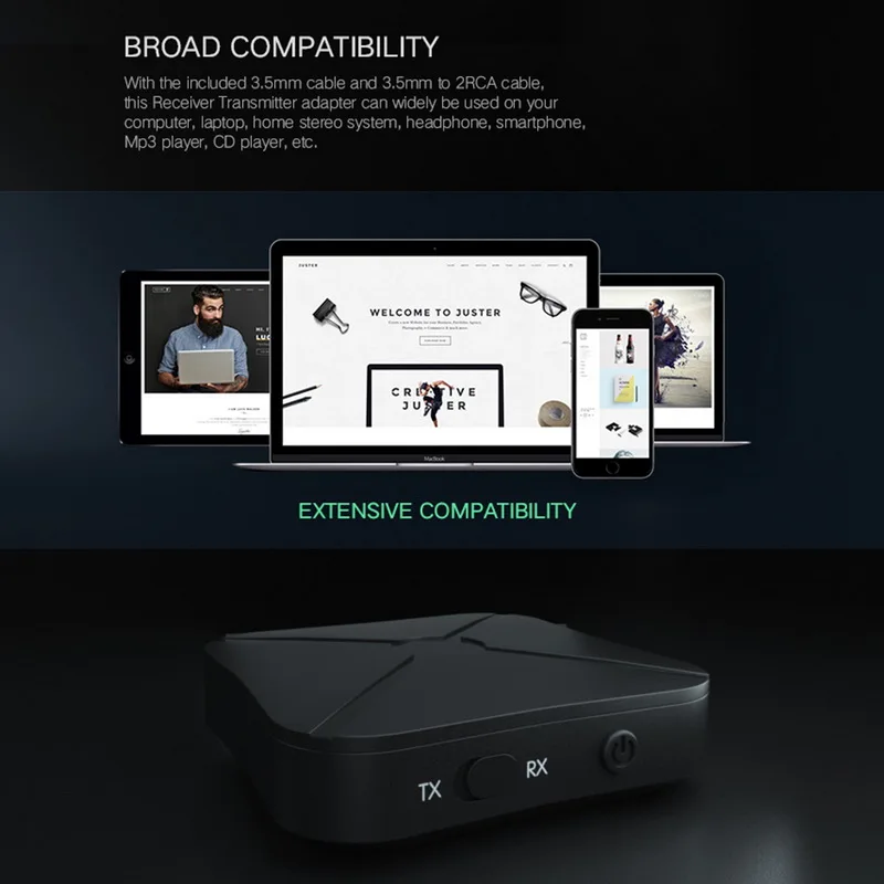 Широкая совместимость: Этот адаптер передатчика приемника может широко использоваться в вашем компьютере, ноутбуке, домашней стереосистеме, гарнитуре, смартфоне, MP3-плеере, cd-плеере и т. д.