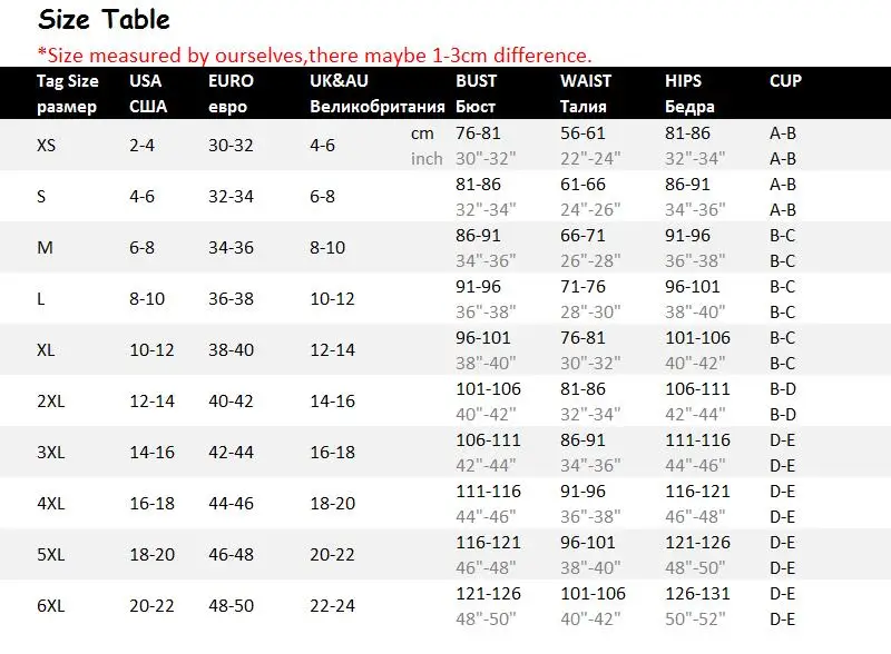 Примечание: купальник эластичный, вышеуказанное предложение только для справки.Примечание:1. Пожалуйста, строго следуйте таблице размеров, чтобы выбрать размер. Не выбирайте напрямую в соответствии с вашими привычками.2. Размер может отличаться на 2-3 см из-за ручного измерения.3. Возможна разница в цвете из-за различных типов компьютеров и мониторов.