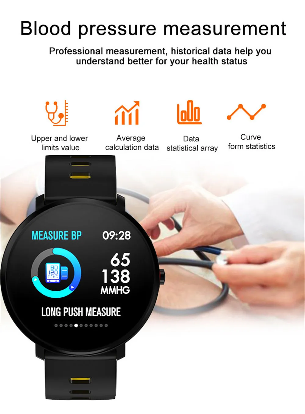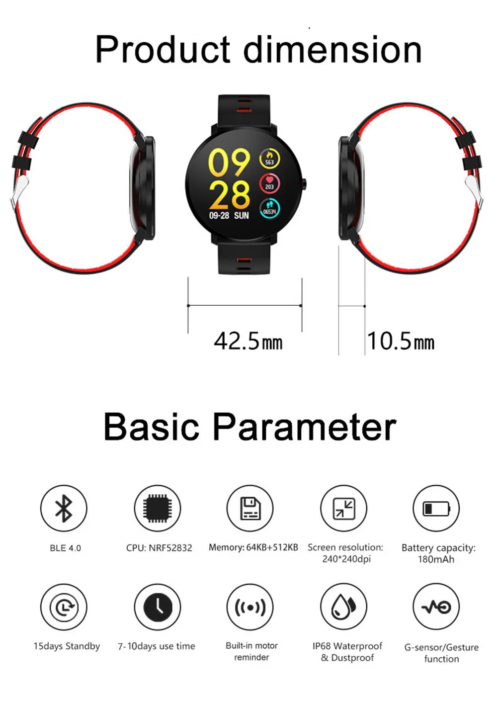 Основные функции: Экран IPS 1,3 дюйма Съемный ремешок 20 мм Обнаружение пульса, определение артериального давления, кислорода Таймер, шагомер, расход калорий, расчет расстояния, пульс, артериальное давление, кислород, монитор сна (время сна, качество сна), включение и выключение дисплея, погода, будильник/сенсор экрана, секундомер Многофункциональные спортивные функции (бег, футбол, Скип, бадминтон, баскетбол, плавание, велосипед, альпинизм, ходьба, шагомер, расход калорий, расчет расстояния) Напоминание о звонках, SMS-напоминание, напоминание о сообщениях в социальных приложениях, поддержка нескольких языков Удаленный захват, управление музыкой Регулировка яркости, бесшумный режим Спецификация: Название приложения: Dafit Системные требования: Система Android версии 4,4 или выше; Система iOS версии 8,0 или выше; Поддержка bluetooth с версией 4,0 Главный чип: NRF52832 Версия Bluetooth: BLE 4,0 Разрешение экрана: 240*240 Емкость аккумулятора: 180 мАч Время работы в режиме ожидания: около 10 дней Часы работы: 3-7 дней Уровень водонепроницаемости: IP68 Поддерживаемые языки приложения: китайский, традиционный китайский, английский, корейский, немецкий, испанский, японский, французский, итальянский, русский, португальский, арабский, украинский