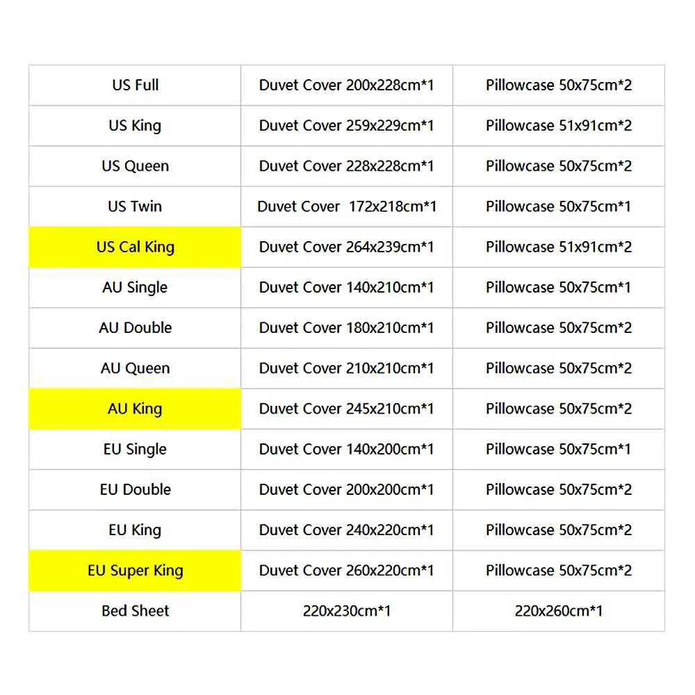 *Note: Bedding set does not have Sheets! If you need sheet, you need order it alone! *Note: The ironing temperature cannot exceed 140 °C. *Due to sewing and thermal transfer, manual measuring, size will has about 5-8cm error. (The bedding set is not including any filling). US Twin: 1 piece Duvet Cover 172x218cm , 1 piece Pillowcase 50x75cm. US Full: 1 piece Duvet Cover 200x228cm, 2 piece Pillowcase 50x75cm. US Queen: 1 piece Duvet Cover 228x228cm, 2 piece Pillowcase 50x75cm. US King: 1 piece Duvet Cover 259x229cm, 2 piece Pillowcase 51x91cm. US Cal King: 1 piece Duvet Cover 264x239cm, 2 piece Pillowcase 51x91cm. AU Single: 1 piece Duvet Cover 140x210cm,1 piece Pillowcase 50x75cm. AU Double: 1 piece Duvet Cover 180x210cm, 2 piece Pillowcase 50x75cm. AU Queen: 1 piece Duvet Cover 210x210cm, 2 piece Pillowcase 50x75cm. AU King: 1 piece Duvet Cover 245x210cm, 2 piece Pillowcase 50x75cm. EU Single: 1 piece Duvet Cover 140x200cm,1 piece Pillowcase 50x75cm. EU Double: 1 piece Duvet Cover 200x200cm, 2 piece Pillowcase 50x75cm. EU King: 1 piece Duvet Cover 240x220cm, 2 piece Pillowcase 50x75cm. EU Super King: 1 piece Duvet Cover 260x220cm, 2 piece Pillowcase 50x75cm. Pillowcase: 1 piece 50x75cm, or 1 piece 51x91cm. Bed Sheet: 1 piece 220x230cm. *This is the design picture show of the bedding set. Not a actual image so that maybe look a little different in real life. Its may a little different between the item u saw with the real item, due to different screens monitor, sunlight,background. *This bedding set is Custom to order. But it will ship very quickly and you will get a tracking number when it ships.