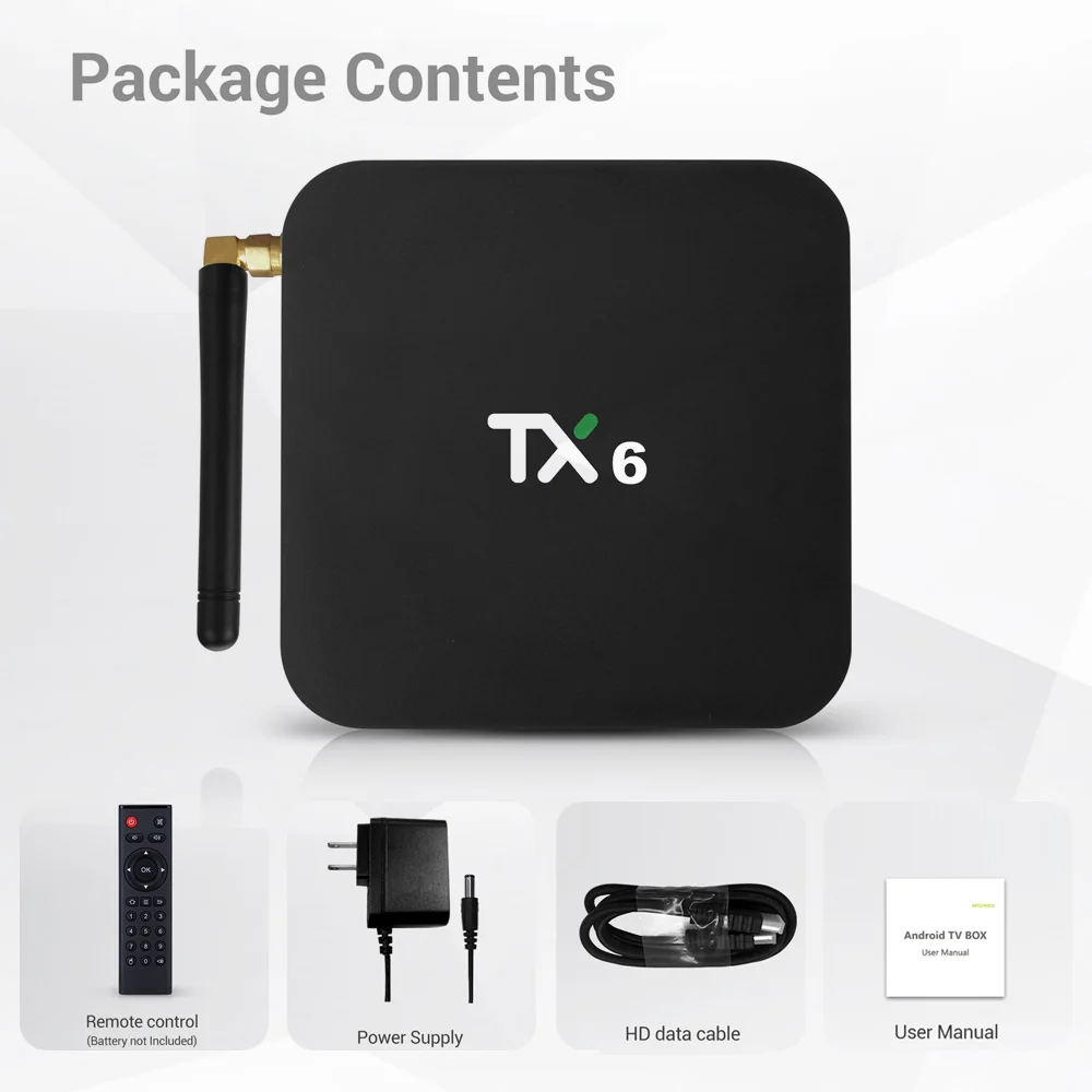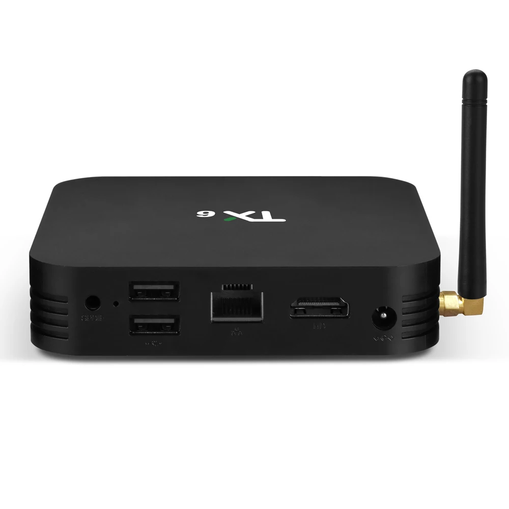 TX6 Smart Android TV Box может изменить ваш традиционный телевизор и ЖК-монитор в мультимедийный центр, подключив интернет (через WiFi или RJ45). Эта умная ТВ-приставка Android принесет вам много удовольствия и удобства благодаря своей мощной функции: Android 9,0, Allwinner H6 Quad core A53 CPU, Mali-T720 GPU, 4 Гб RAM и 64 ГБ ROM, 4K UHD видео аппаратное декодирование, 2,4G / 5G двухдиапазонный WiFi и подключение BT 4,1. Просто подключите его к телевизору, и вы готовы к работе!