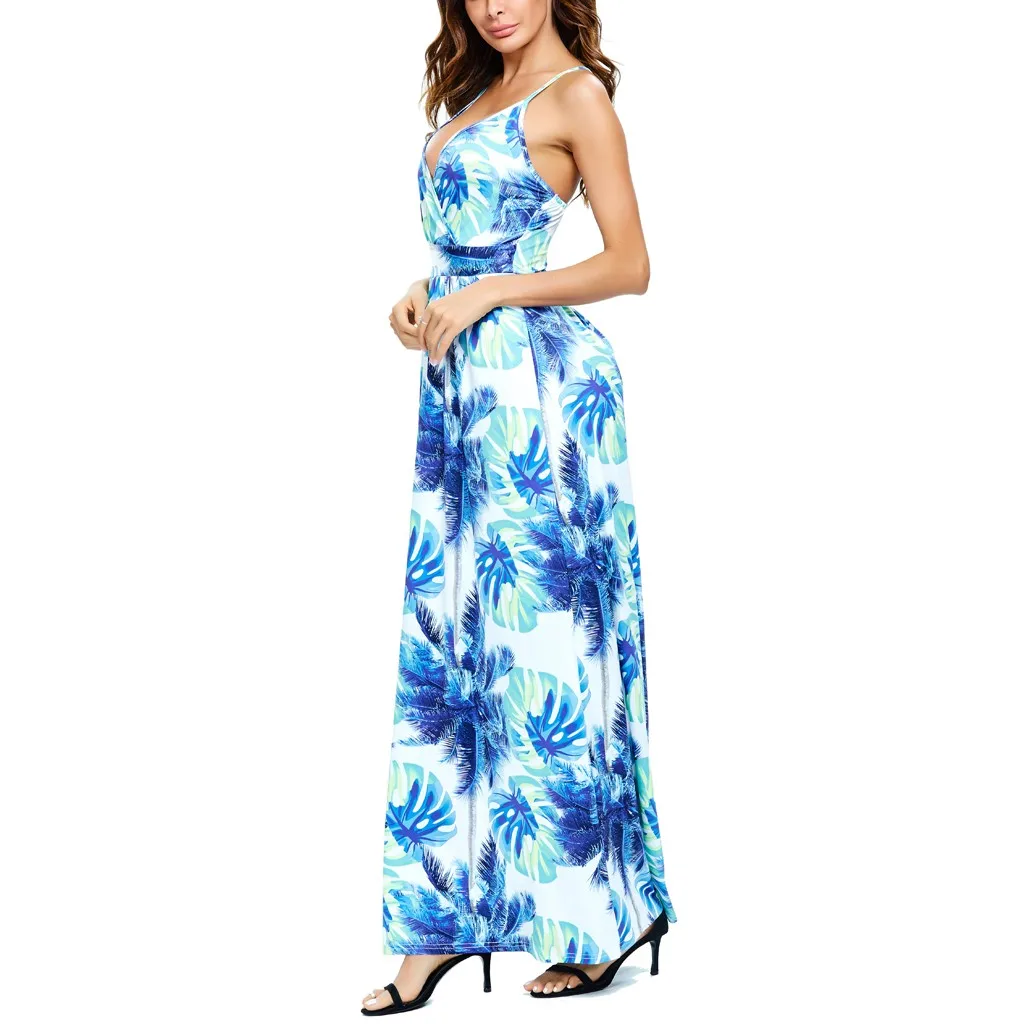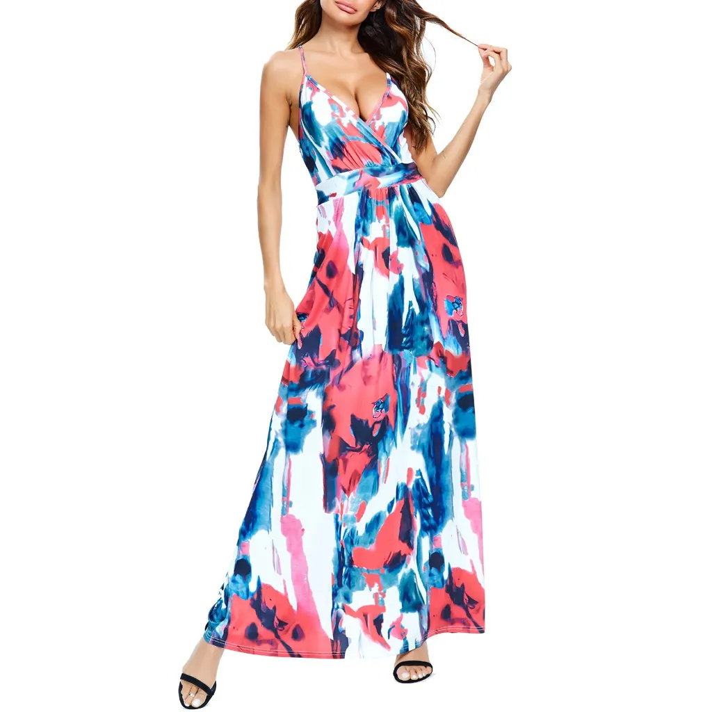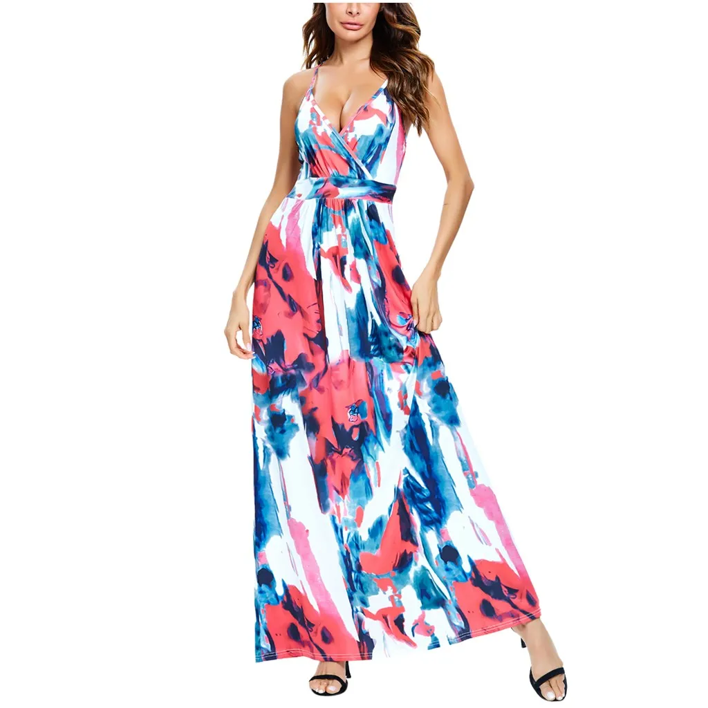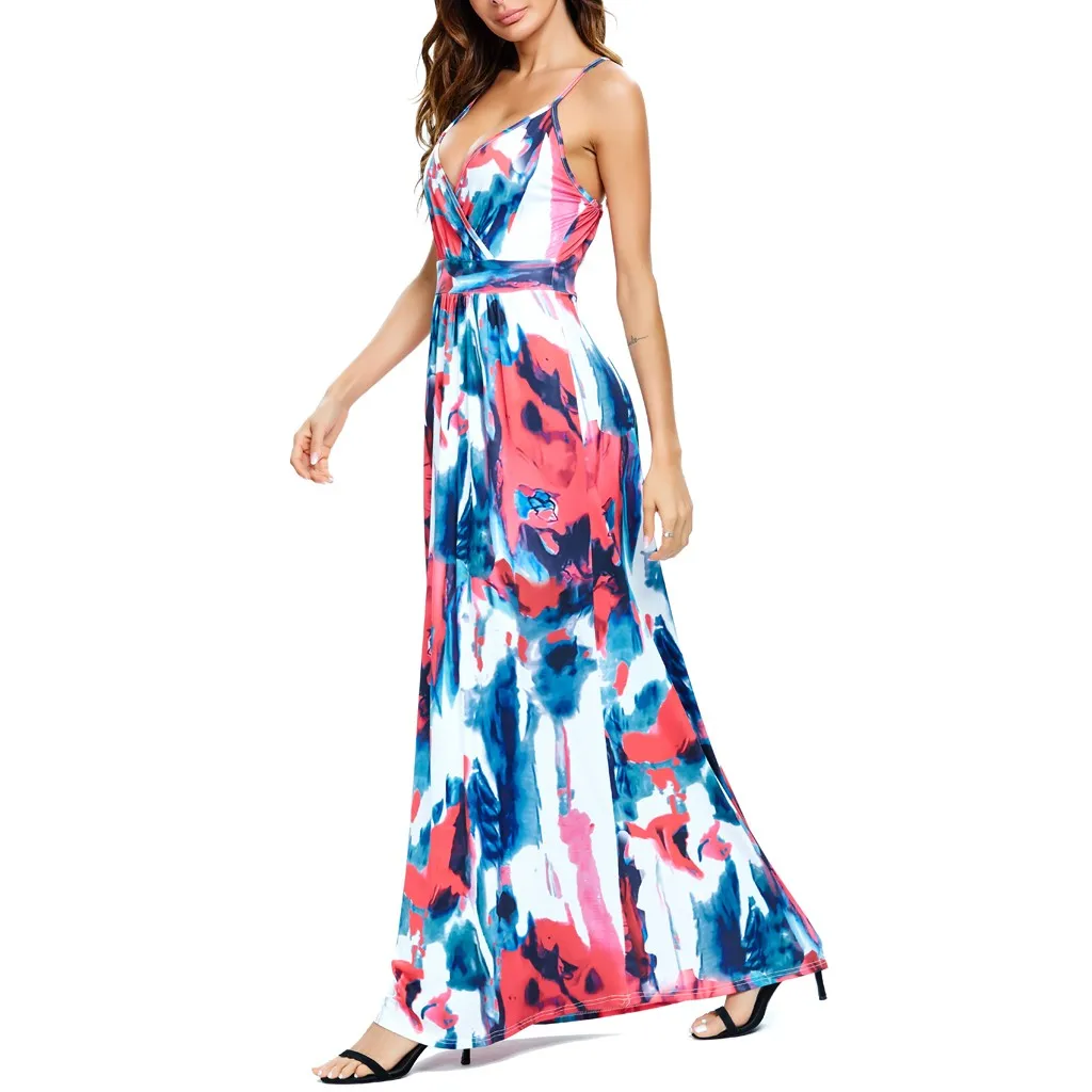 Сексуальное женское платье с v-образным вырезом, без рукавов, с принтом красителя, Повседневные Вечерние пляжные длинные платья