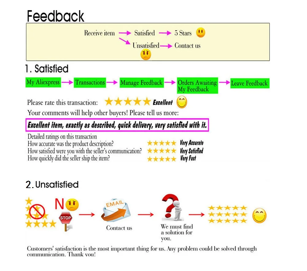 Способы оплаты: Перед размещением заказа, пожалуйста, подтвердите детали с нами, если у вас есть запрос на продукт. Пожалуйста, сделайте оплату в течение 3 дней после заказа, если это возможно. Отгрузка: 1. Сроки подготовки: для подготовки вашего заказа нам понадобится от 3 до 5 рабочих дней, в зависимости от количества получаемых заказов. 2. Пожалуйста, дважды проверьте свой адрес, когда вы пишете в aliexpress, если вы хотите изменить, прежде чем мы отправим их, пожалуйста, обратите внимание на новый адрес. Отслеживания посылки: Если вы хотите отследить свою посылка, вы можете выбрать следующую ссылку, чтобы проверить логистическую информацию вашей посылка. //www.17track.net/zh-cn Оценка: Если вы удовлетворены нашей продукцией, вы можете дать нам хорошую оценку. Спасибо!