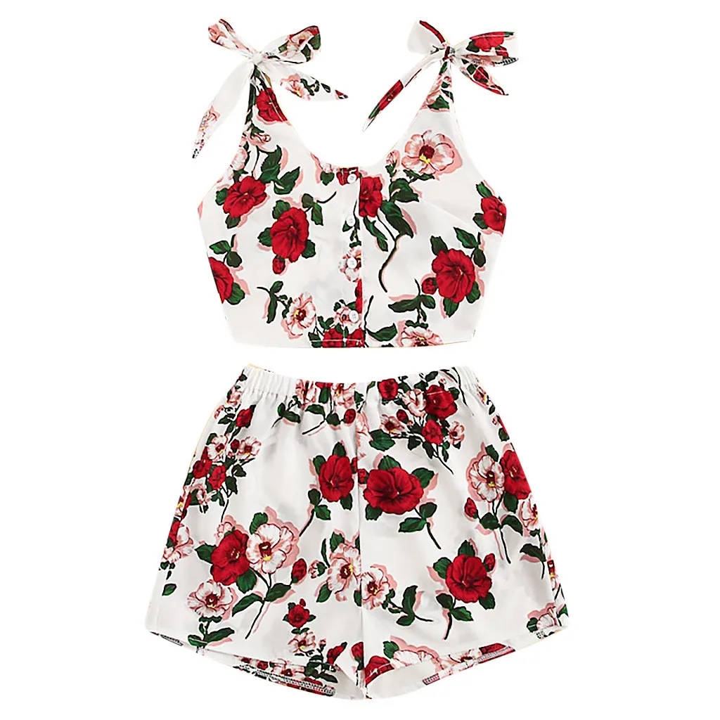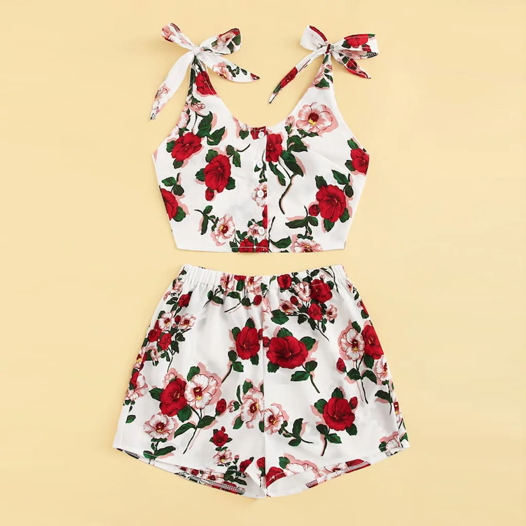 Особенности: 2 шт., модный костюм, цветочный принт, майка с бантом + шорты, круглый вырез, пуговица, без рукавов,Стильный и модный дизайн, летний женский комплект.