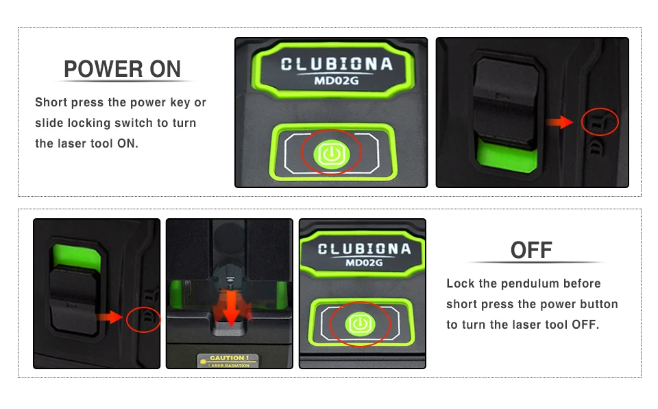 Выключите лазерные линии: только когда маятник заблокирован, нажмите кнопку питания и удерживайте его в течение 3 секунд, лазерные линии могут быть отключены.