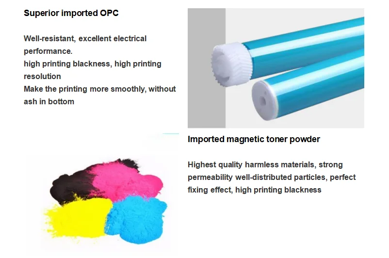 Мы принимаем все виды высококачественного сырья, и мы делаем строгие испытания на каждый продукт перед отправкой, чтобы гарантировать высокое качество продукции. Наш тонер-картридж использует все виды высококачественного импортного сырья, углеродный порошок из США, OPC из Южной Кореи, углерод из Индии, новый совместимый тонер-картридж имеет лучшее качество и сюрприз эффект, чем оригинал.