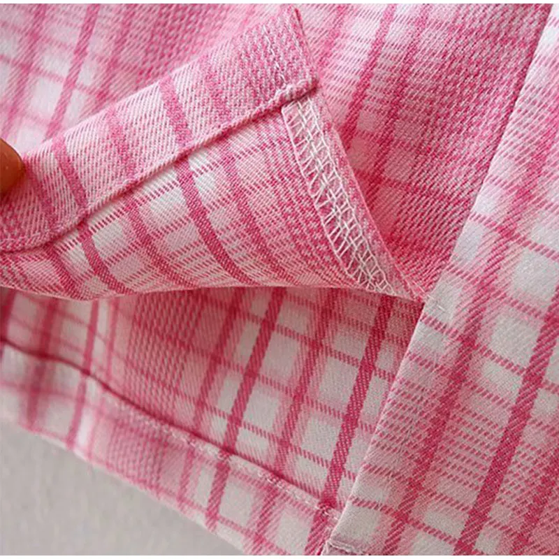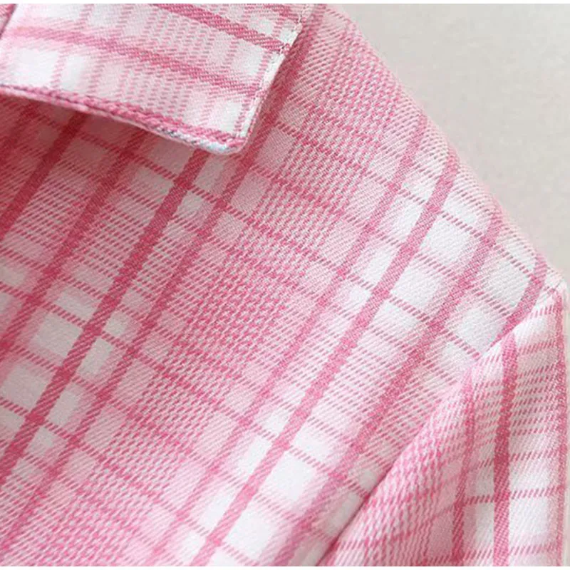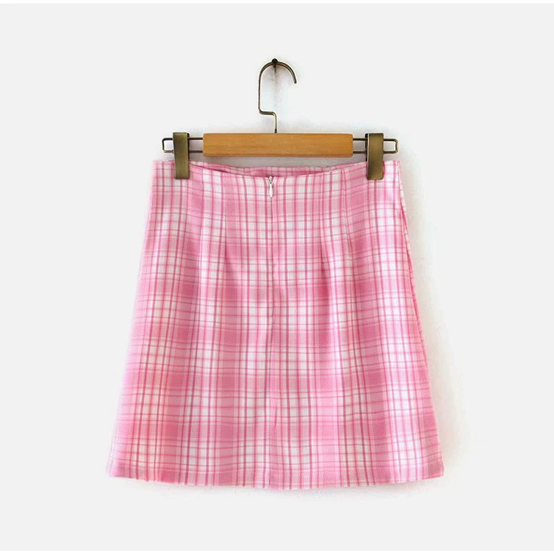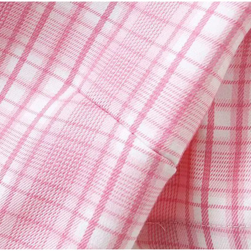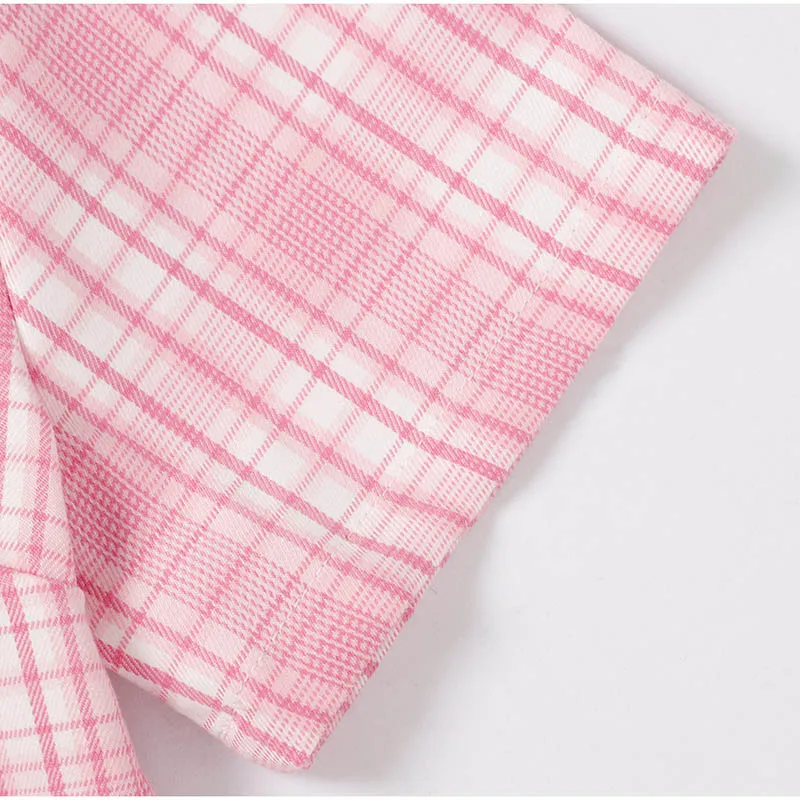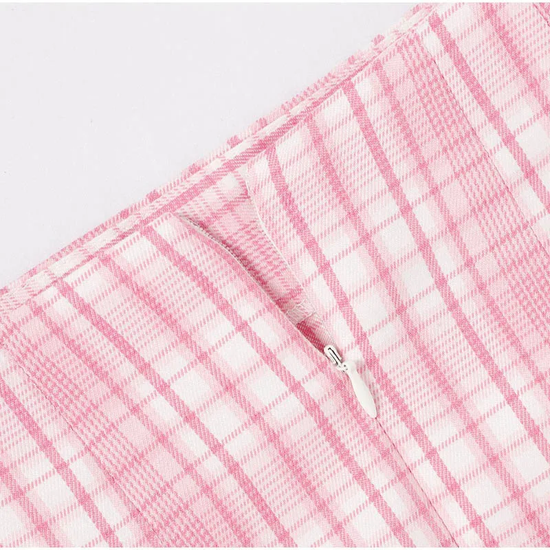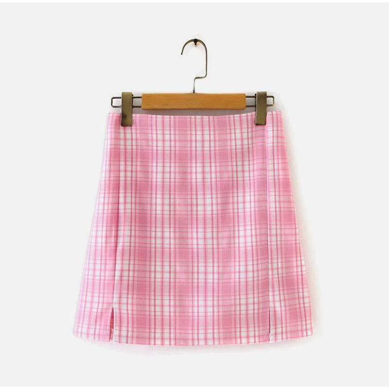 Pink Plaid Notched Sweet 2 Piece Sets Women Short Sleeve Patchwork T-Shirt And Split Mini Skirt Female Set Summer Fashion Ladies Suits