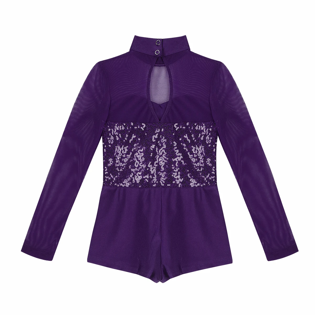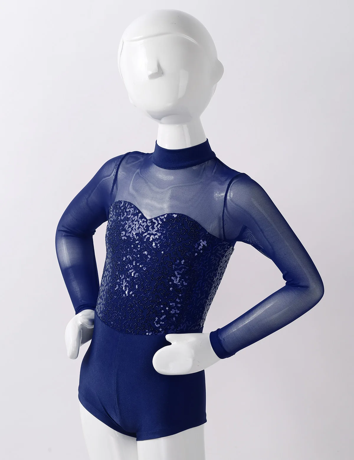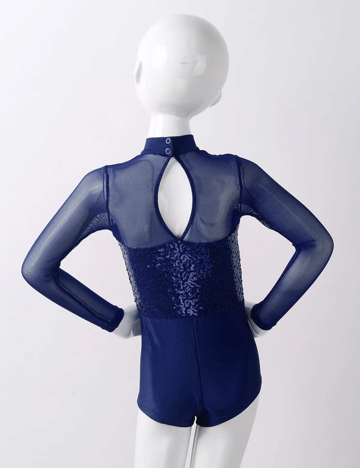 Kids Dance Wear Teens Girls Long Sleeves Mock Neck Sparkly Sequins Tulle Splice Ballet Gymnastic Leotard Ballet Biketard Unitard
