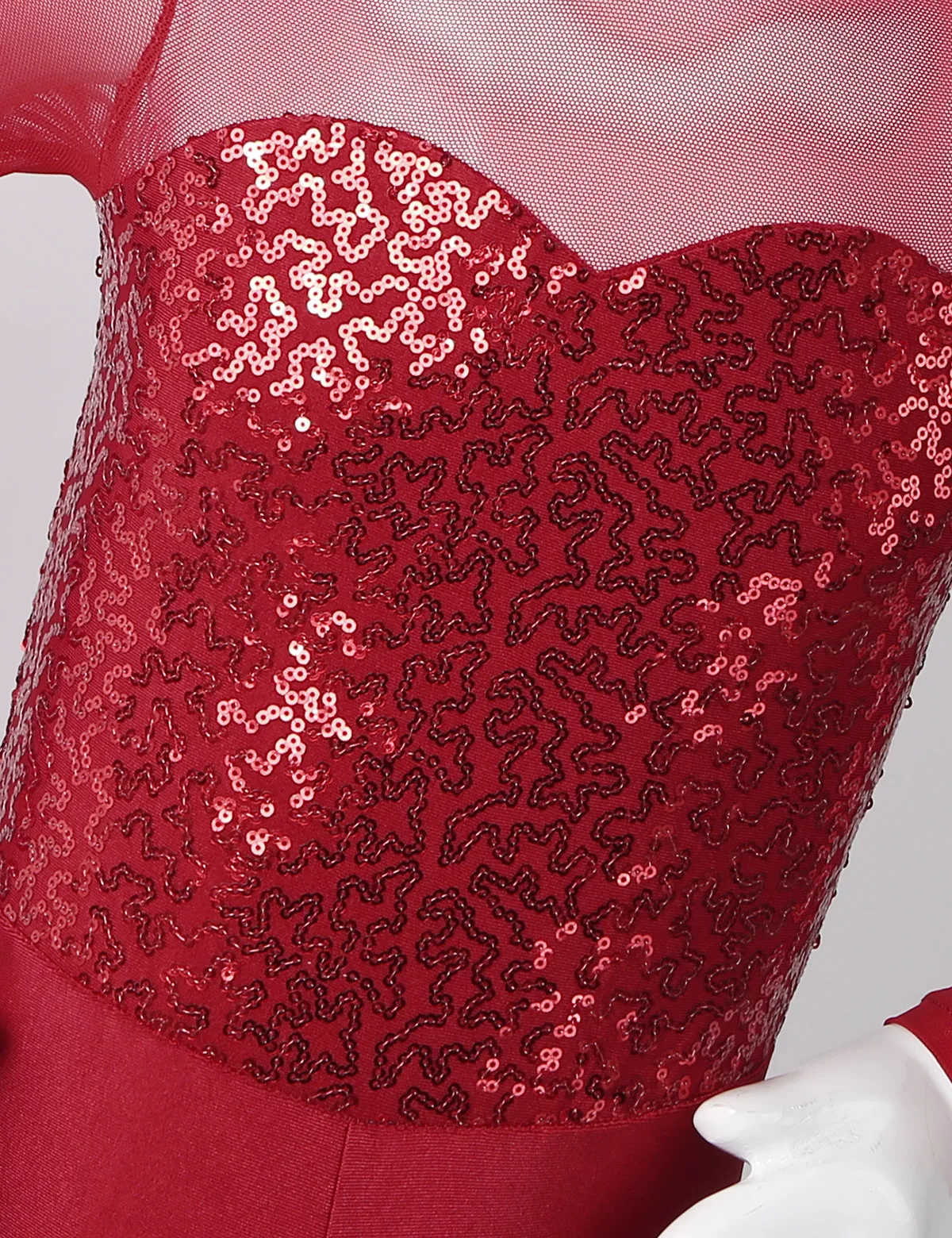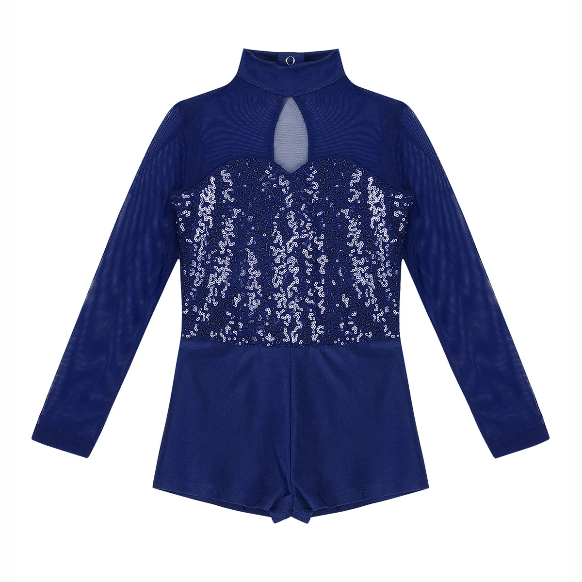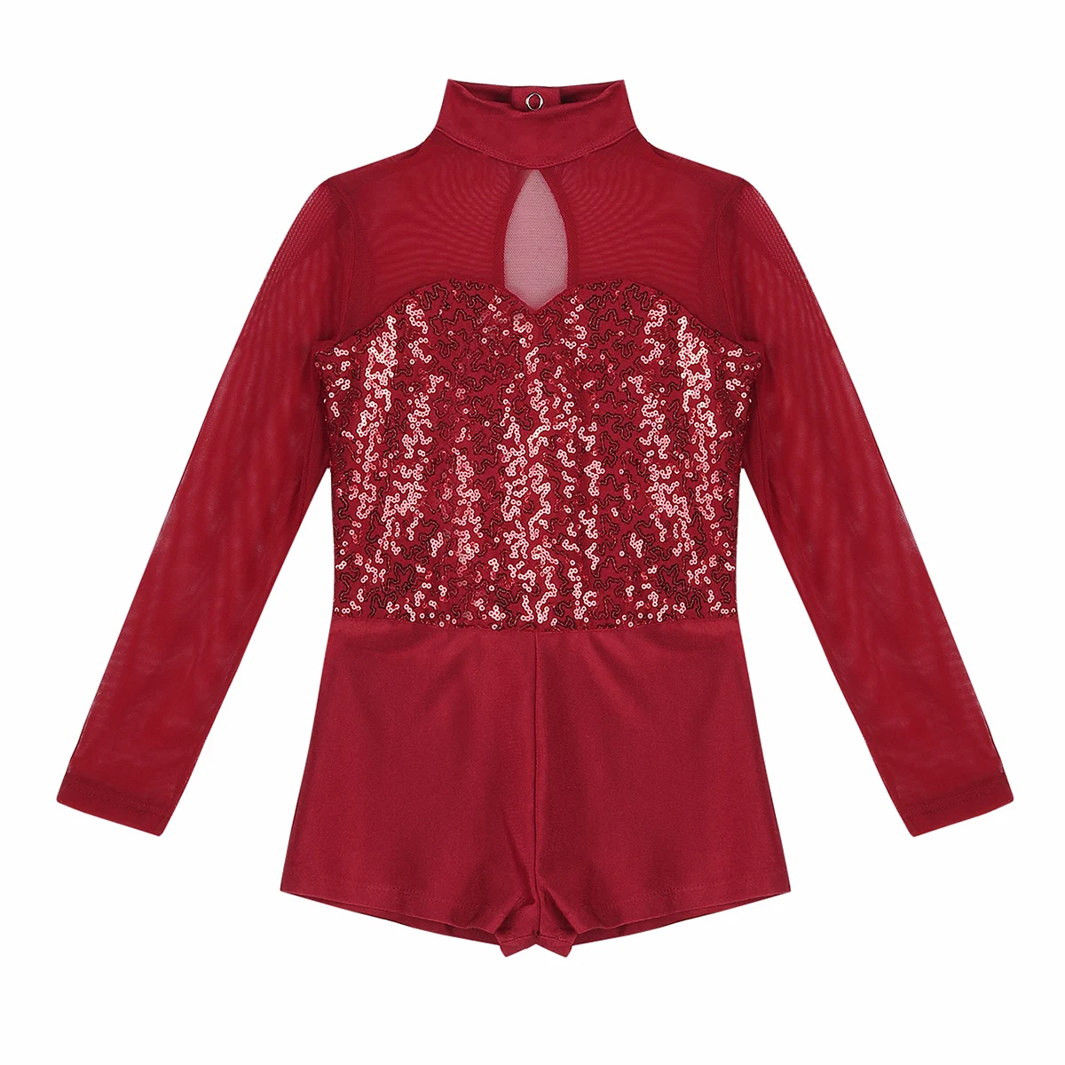 Kids Dance Wear Teens Girls Long Sleeves Mock Neck Sparkly Sequins Tulle Splice Ballet Gymnastic Leotard Ballet Biketard Unitard