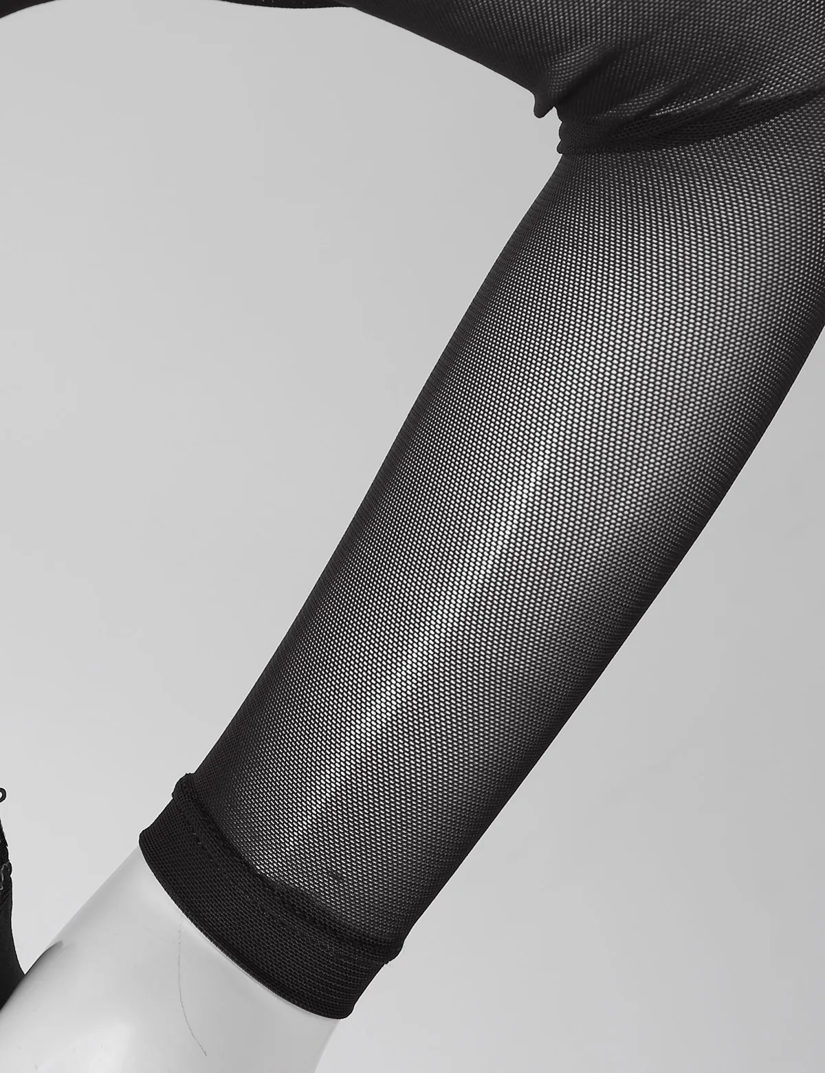 Long sleeve, mock neck with press buttons closure. Shiny sequined top bodice, with lining. Tulle splice design.