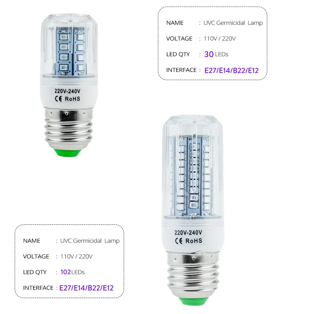 * С формой кукурузы, он может излучать светильник, который является более эффективным * есть E14, E27, E12,B22,E26 5 интерфейс и 102 светодиода, 30 светодиодных ламп для вас на выбор * Установите эту бактерицидную лампу UVC в вашей комнате, чтобы вы могли без бактерий * Использование более 1 часа может эффективно убить 99.99% E. coli, Proteus, Staphylococcus aureus, Staphylococcus aureus и Bacillus subtilis. * Клещи: кровати, диваны, одеяла, подушки и полотенца больше не делают кожу зудящей и красной. * Убивает бактерии, бактерии: убивает плесень, грибок, Е. coli и т. д. * удаление запахов: удаление невыносимых запахов из мусорных банок, туалетов, кухонь, холодильников, шкафов, обувных шкафов, складов и т. д. * Зеленый и эффективный, чистый физический метод стерилизации, отсутствие вторичного загрязнения. * Мощная бактерицидная лампа, широко используемая в домах, больницах, магазинах, школах, ресторанах... * После использования бактерицидной лампы UVC будет присутствовать запах солнечного света.