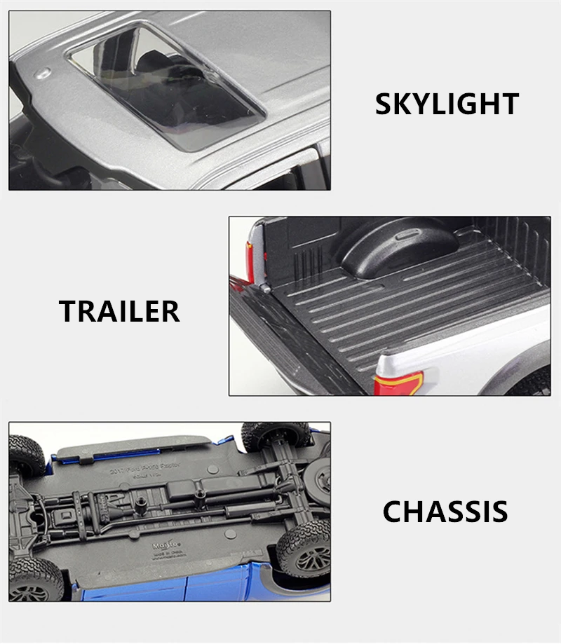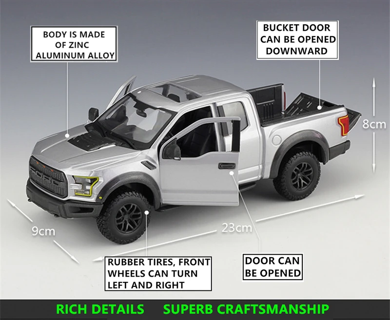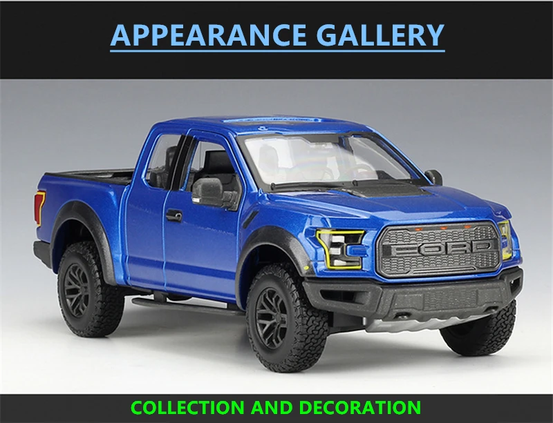 Введение продукта Название: 2017 Ford F-150 Raptor Бренд: Maisto Размер: около 23*8*9 см Масштаб: 1/24 Материал: основной корпус-цинковый сплав, другие-АБС и Резина Наши продукты гарантированно являются аутентичными. Оригинальная Заводская оригинальная коробка. Официальное разрешение Этот продукт является коллекционной игрушкой, за исключением электрической. Шины могут быть перемещены, и рулевое колесо двери может быть перемещено.