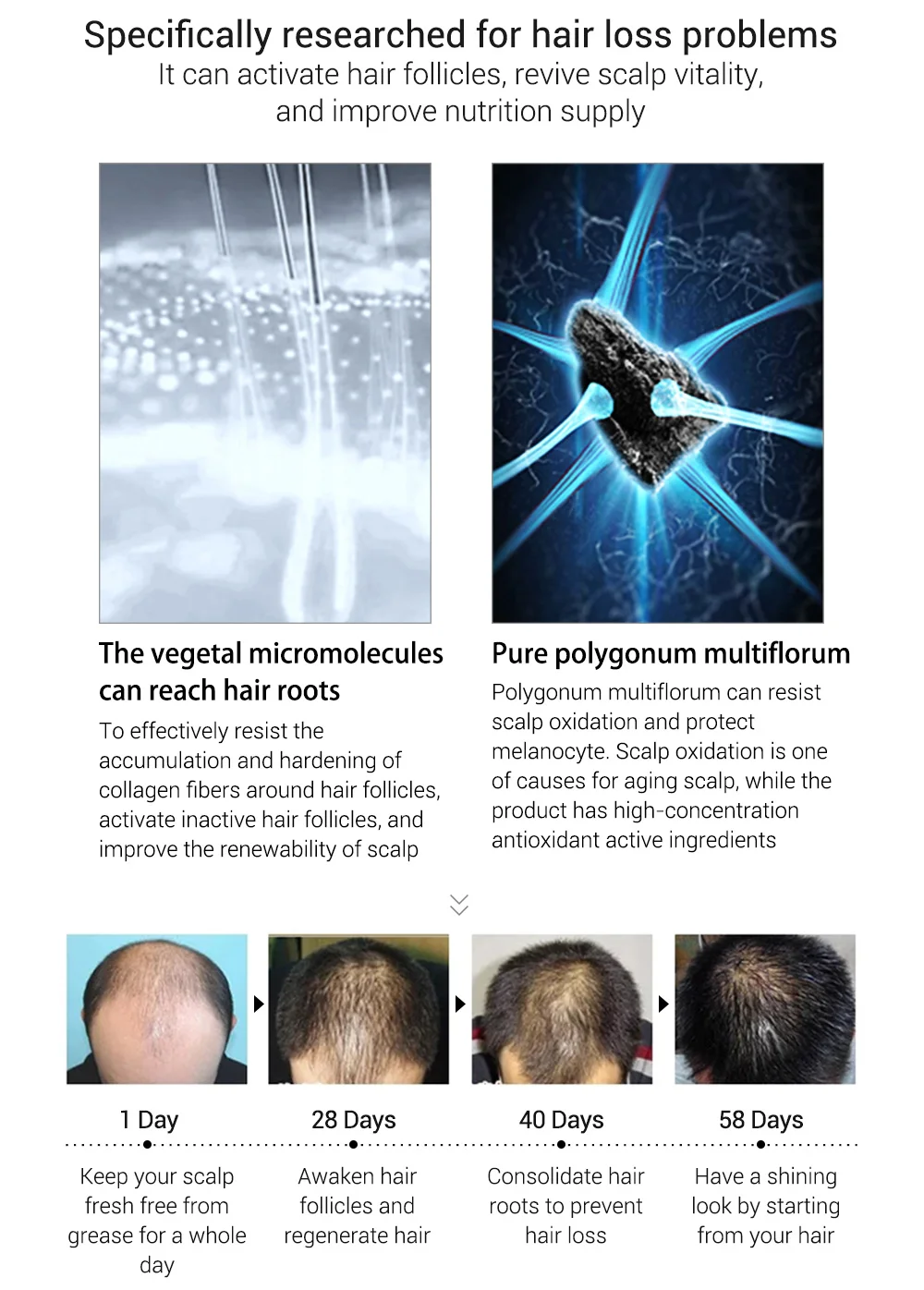 Специально исследованы проблемы с выпадением волос Он может активировать волосяные фолликулы, оживить жизненную силу кожи головы и улучшить питание Микромолекулы растительного происхождения могут достигать корней волос Чтобы эффективно противостоять накоплению и упрочнению коллагеновых волокон вокруг волосяных фолликул, активируйте неактивные волосяные фолликулы и улучшите возобновляемость кожи головы Чистый многоцветовый полигон Многоцветовые полигоны могут противостоять окислению кожи головы и защищать меланоцит. Окисление кожи головы является одной из причин старения кожи головы, в то время как продукт обладает высокой концентрацией антиоксидантных активных ингредиентов 1 день Держите кожу головы свежей без жира в течение всего дня 28 дней Разбудите волосяные фолликулы и восстановите волосы 40 дней Закрепите корни волос, чтобы предотвратить выпадение волос 58 дней Обратите внимание, начиная с ваших волос Позвольте факту говорить за эффективность