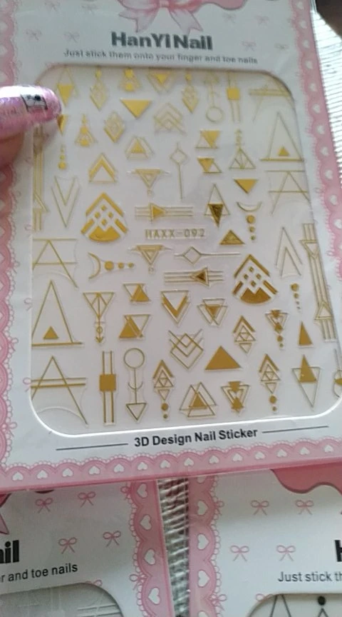 Спецификация: Количество: 3 листа Размеры каждого листа: 10,5*8,3 см прибл. Цвет: черный/белый/золотой, геометрической формы Посылка: 3 листа/Набор 3D наклейки для ногтей Как использовать: 1. Очистите поверхность, где будет размещен дизайн. 2. Выберите дизайн и отклейте гвоздь. (Не прикасайтесь к клею) 3. Поместите дизайн в ноготь/кончик и аккуратно протрите его несколько раз. 4. Нанесите верхнее пальто для лучшего результата.
