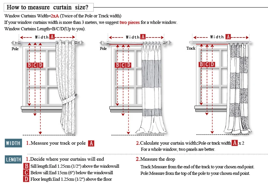 Ширина оконных штор = 2xA (в два раза больше полюса или ширины дорожки)