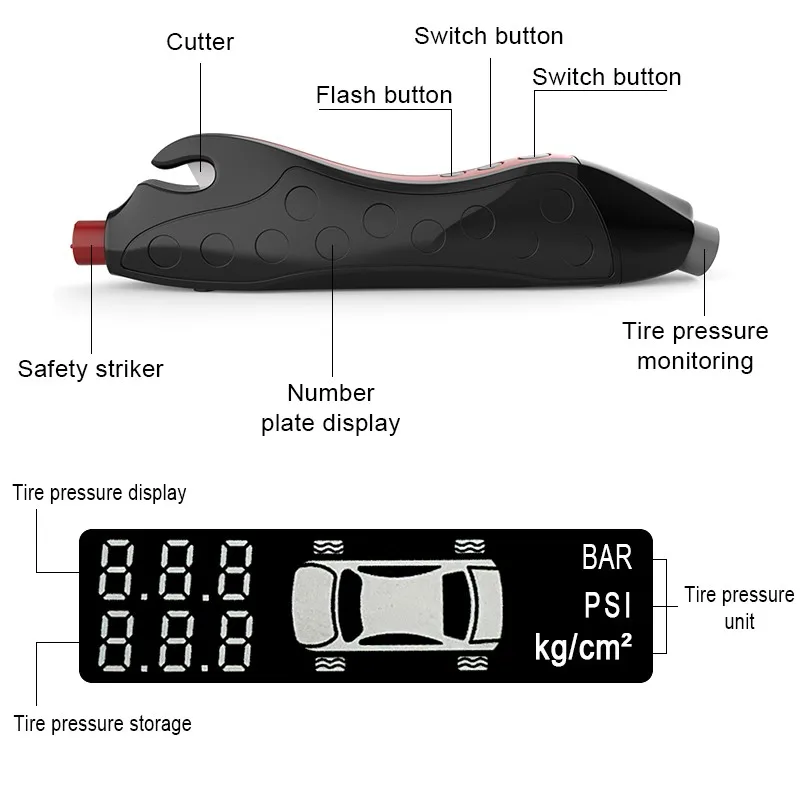 Автомобильный инструмент для безопасности, измеритель давления в шинах, цифровой дисплей, оконный выключатель, резец для безопасности Предупреждение ющий светильник светодиодный, ночник, вспышка, светильник