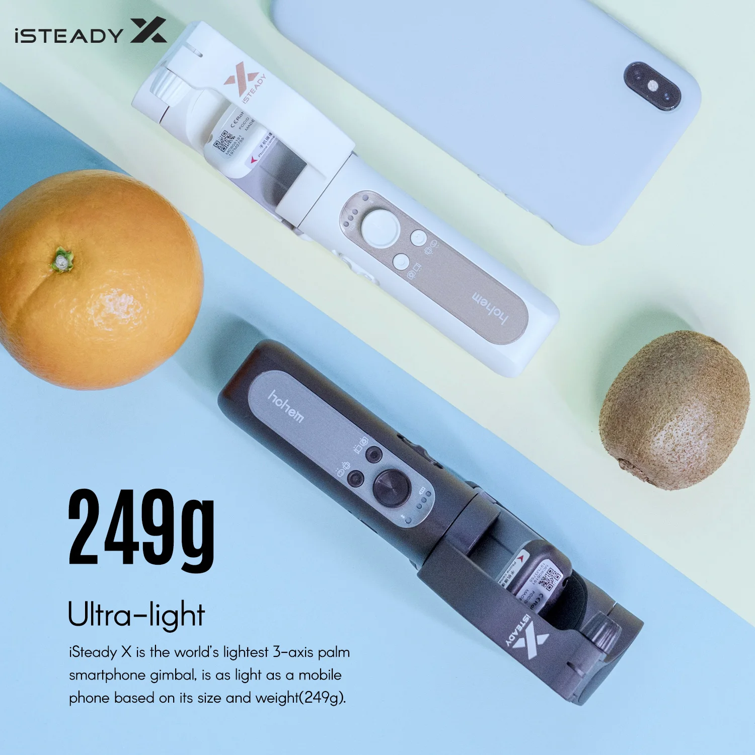249 г Сверхлегкий:ISteady X-это самый легкий в мире 3-осевой ладони смартфона gimbal, такой же легкий, как и чехол для мобильного телефона на основе его размера и веса (249 г).