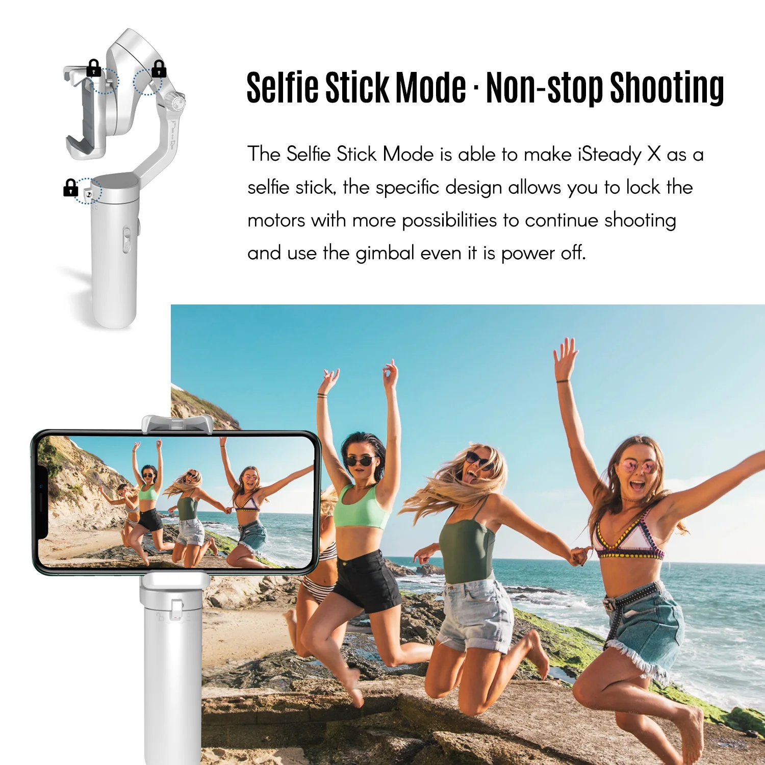 Режим селфи-палки · безостановочная съемка:Режим селфи-палки способен сделать iSteady X в качестве селфи-палки, Специфическая конструкция позволяет блокировать двигатели с более широкими возможностями для продолжительной съемки и использовать карданный стабилизатор даже при отключении питания.