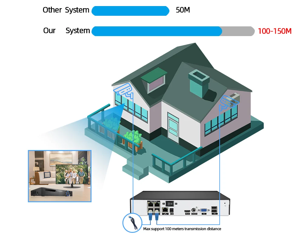 Нет дополнительных кабелей питания или адаптеров, просто подключив ip-камеру к NVR с помощью одного кабеля,