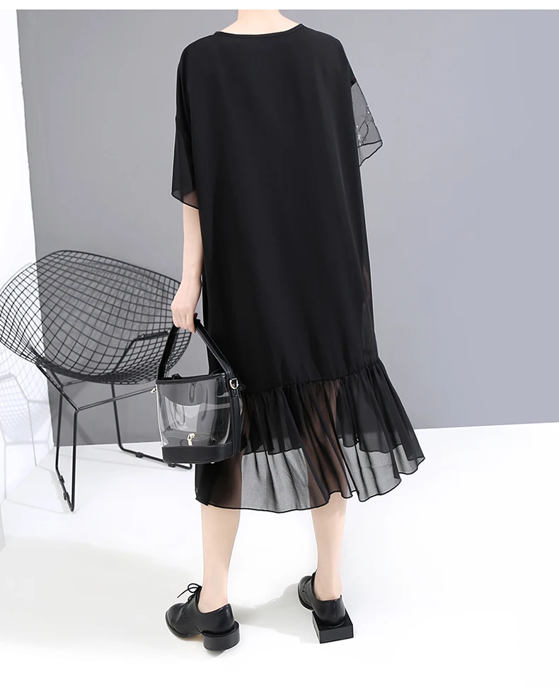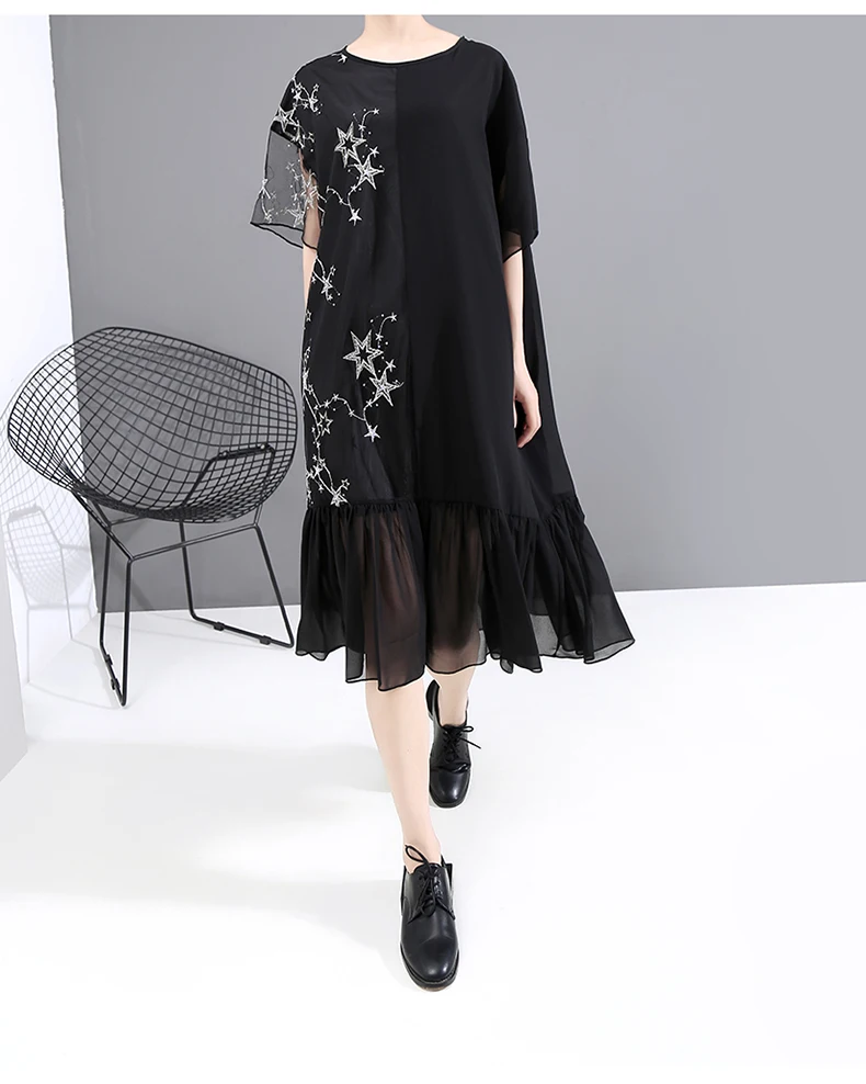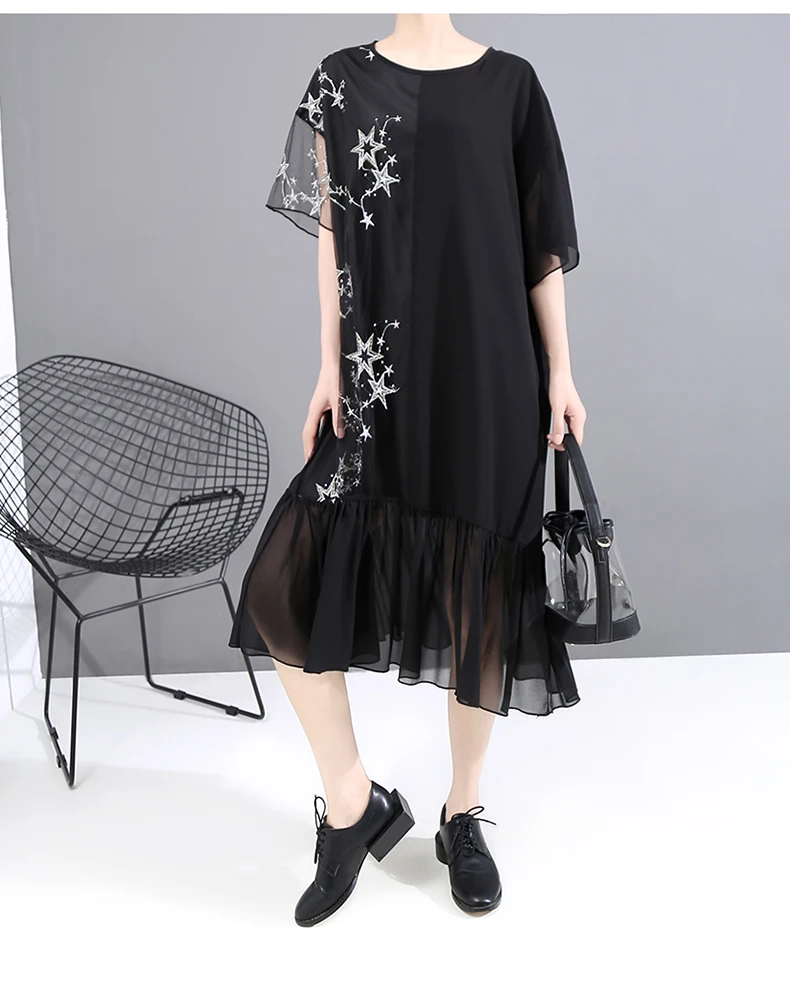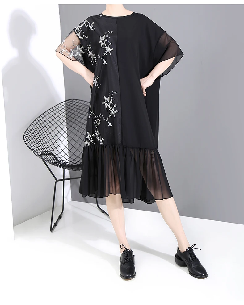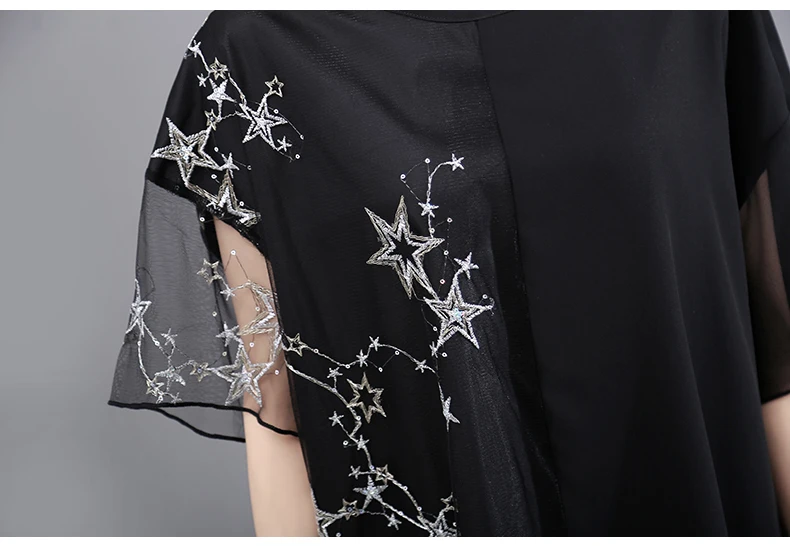 Новинка 2020, женское летнее черное платье большого размера с вышивкой в виде звезд, шифоновое повседневное прямое платье средней длины с круглым вырезом, 6303