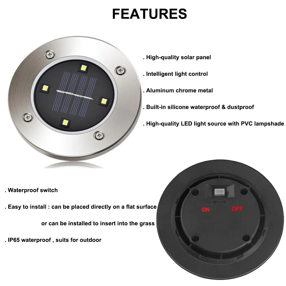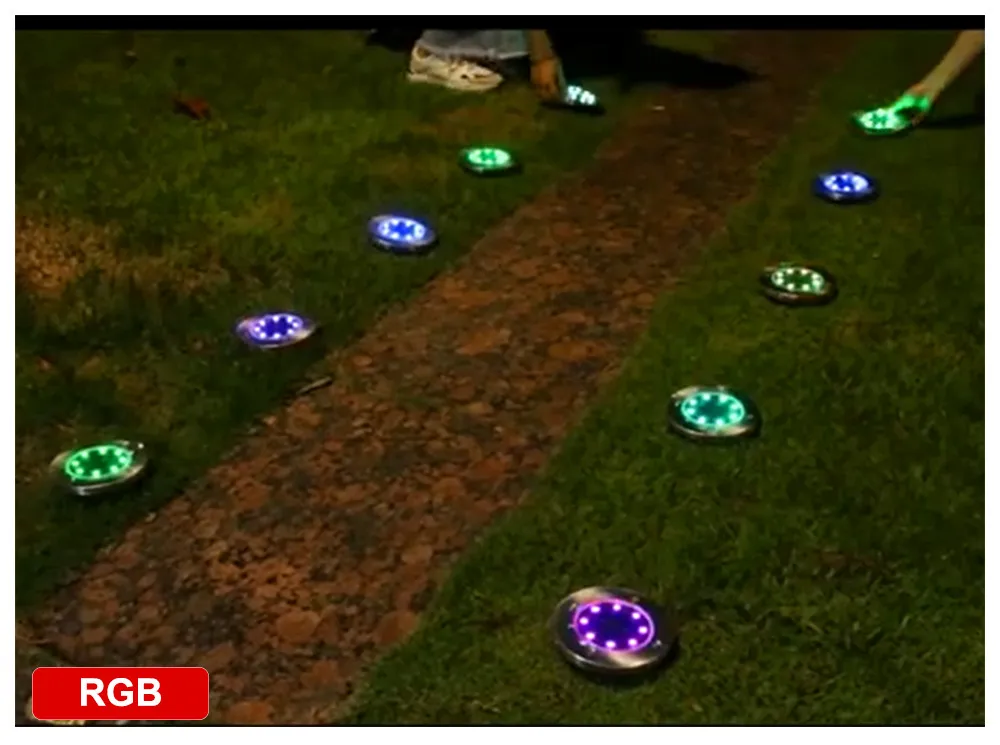 Особенности: 1. Высокое качество панели солнечных батарей, интеллигентая (ый) светильник контроля. Автоматическая зарядка в течение дня, а также автоматический светильник ing в темное время суток, ноль, плата за электроэнергию в течение всего года. 2. Качественный светодиодный светильник источник с абажуром из ПВХ, форма светильник и текстуру. Светодиодный яркость до 40lm, встроенный 600 мАч перезаряжаемый аккумулятор, для получения точного результата нужно всего лишь 6-8 часов, чтобы быть полностью заряженным и может работать в течение 8-10 часов рабочего времени. 3. Водонепроницаемый IP65, Водонепроницаемый переключатель и Алюминий хромированный металл, не боится, стойкие к износу и коррозии. Встроенный силиконовый класс водо-и пыленепроницаемости:, не боятся дождя. 4. Легко установить, он содержит вилка с заземлением, светильник может быть установлена непосредственно на земле или также могут быть установлены для того, чтобы вставить в траве. 5. Подходит для декорирования двора, сад, лужайка, дорога, парк и т. д. Параметры: -Название товара: Солнечная наземная светильник -Светодиодный: 4/8/12/16 шт. светодиодный -- Светильник Цвет: белый светильник, белый, RGB (только в том случае, 8LED) -Панель солнечных батарей: 2V/130ma -- Батарея: 1*600 мАч металл-гидридных или никель Батарея -- Водонепроницаемый уровень: IP65 -Время зарядки: 6-8 часов -Время работы: 8-10 часов -- Материал: нержавеющая сталь и АБС-пластика -- Вес: 134 г/шт.