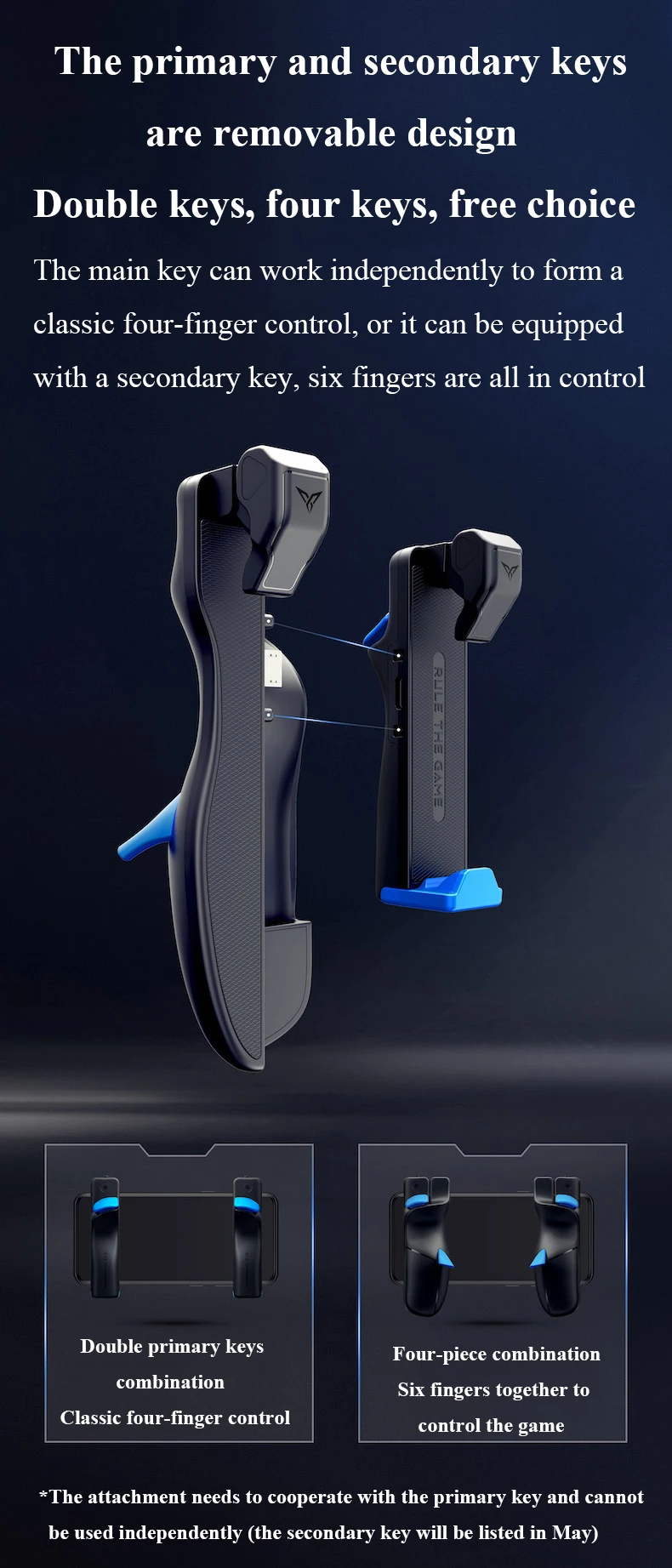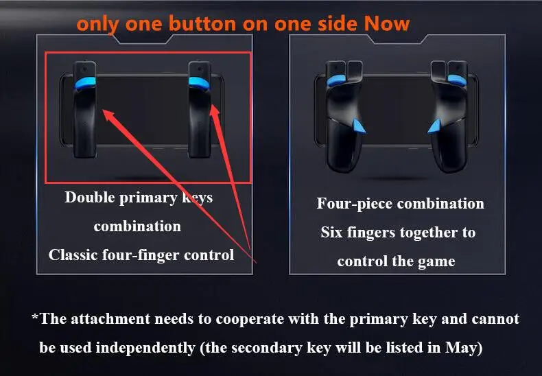 Двойные клавиши, четыре клавиши, бесплатный выбор основной ключ может работать независимо, чтобы создать классическое управление четырьмя пальцами, или он может быть оснащен дополнительным ключом, Шесть пальцев все в управлении двойные основные клавиши сочетание классического четырехпальцевого управления четырехсекционная комбинация шесть пальцев вместе для управления игрой * вложение должно сотрудничать с основным ключом и не может быть использовано самостоятельно (дополнительный ключ будет указан в мае)